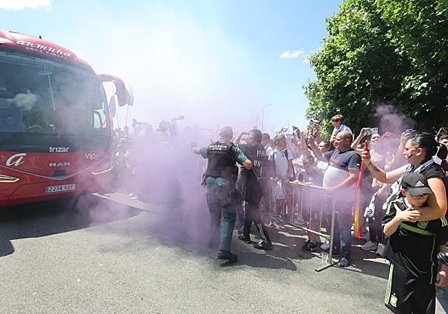 Las bengalas han presidido tanto la entrada a las instalaciones del campo como a los vestuarios, con la Guardia Civil abriendo paso al autocar entre la multitud de seguidores. Muchos de ellos a cánticos de «Salamanca te quiero, te vengo a ver ascender» y «Unión, échale huevos».