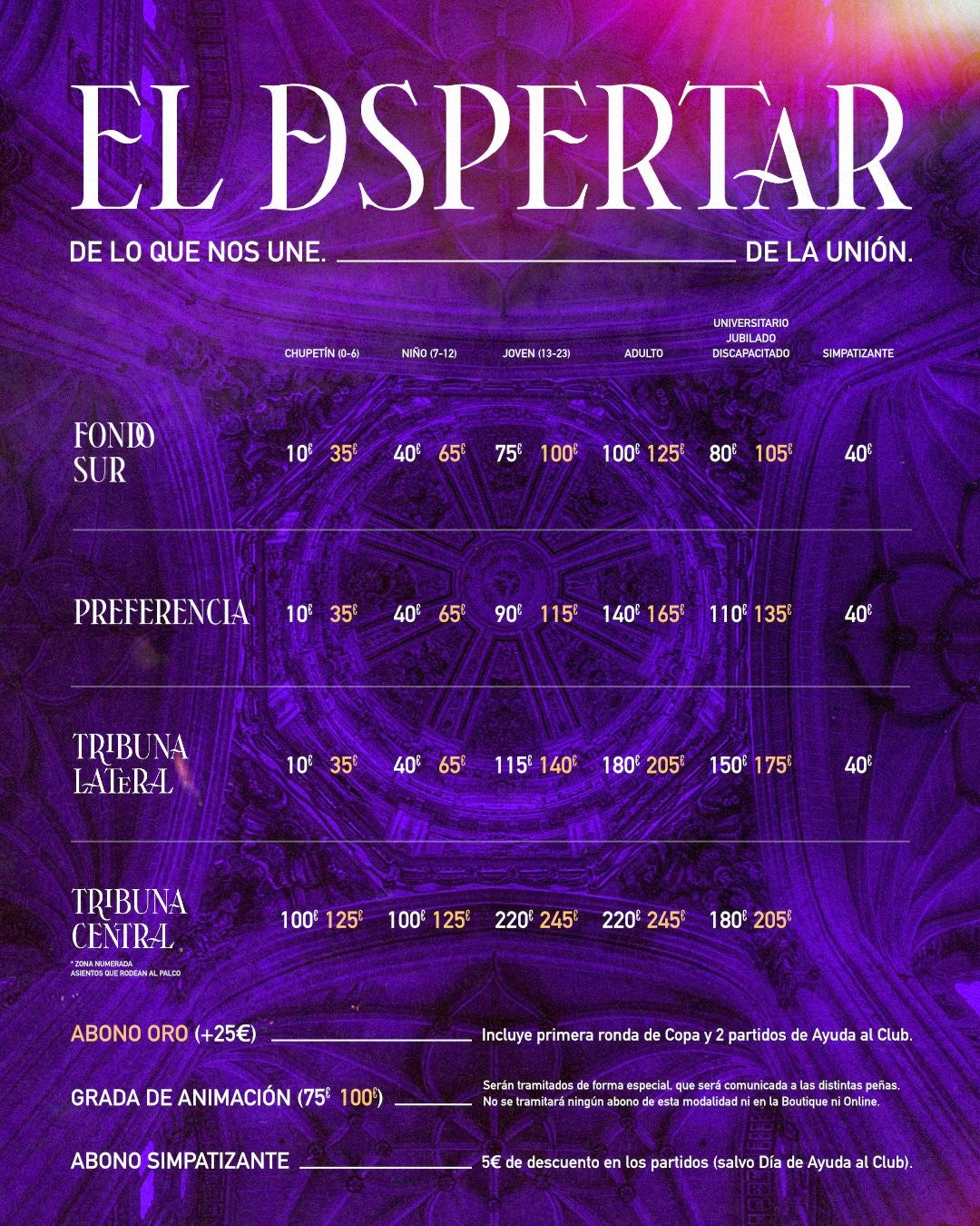 Aunque los precios de los abonos son muy diferentes en función de la edad o la condición (jubilado, estudiante, discapacitado o el abono familiar que tendrán distintos descuentos) y hasta la posibilidad de tener abono de simpatizante, a modo de resumen, el abono adulto en el Fondo Sur será de 100 euros, en Preferencia costará 140 euros, 220 en la nueva zona de Tribuna Central y 180 en el resto de la Tribuna. No hay que olvidar que en caso de que el abono sea de la modalidad 'Oro', a estos precios habrá que sumarle 25 euros más.