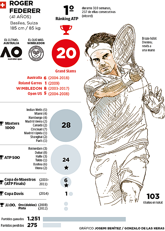 Con Federer se va uno de los más grandes de la historia. Sus 20 títulos de Grand Slam, sus 310 semanas como número uno, sus 103 títulos ATP, sus más de 1.250 victorias y su estilo, el más especial de cuantos han pisado una pista, le han elevado al olimpo en el que están solo unos pocos. Unos prefieren a Djokovic, otros a Nadal, pero el legado que ha dejado Federer provoca la sensación de que, con su marcha, nada volverá a ser igual en el deporte de la raqueta. Su revés a una mano, su volea, su derecha y su forma de jugar al tenis sin mostrar esfuerzo serán una leyenda con la que tendrán que convivir todos aquellos que descubran este deporte ya sin Federer en él.