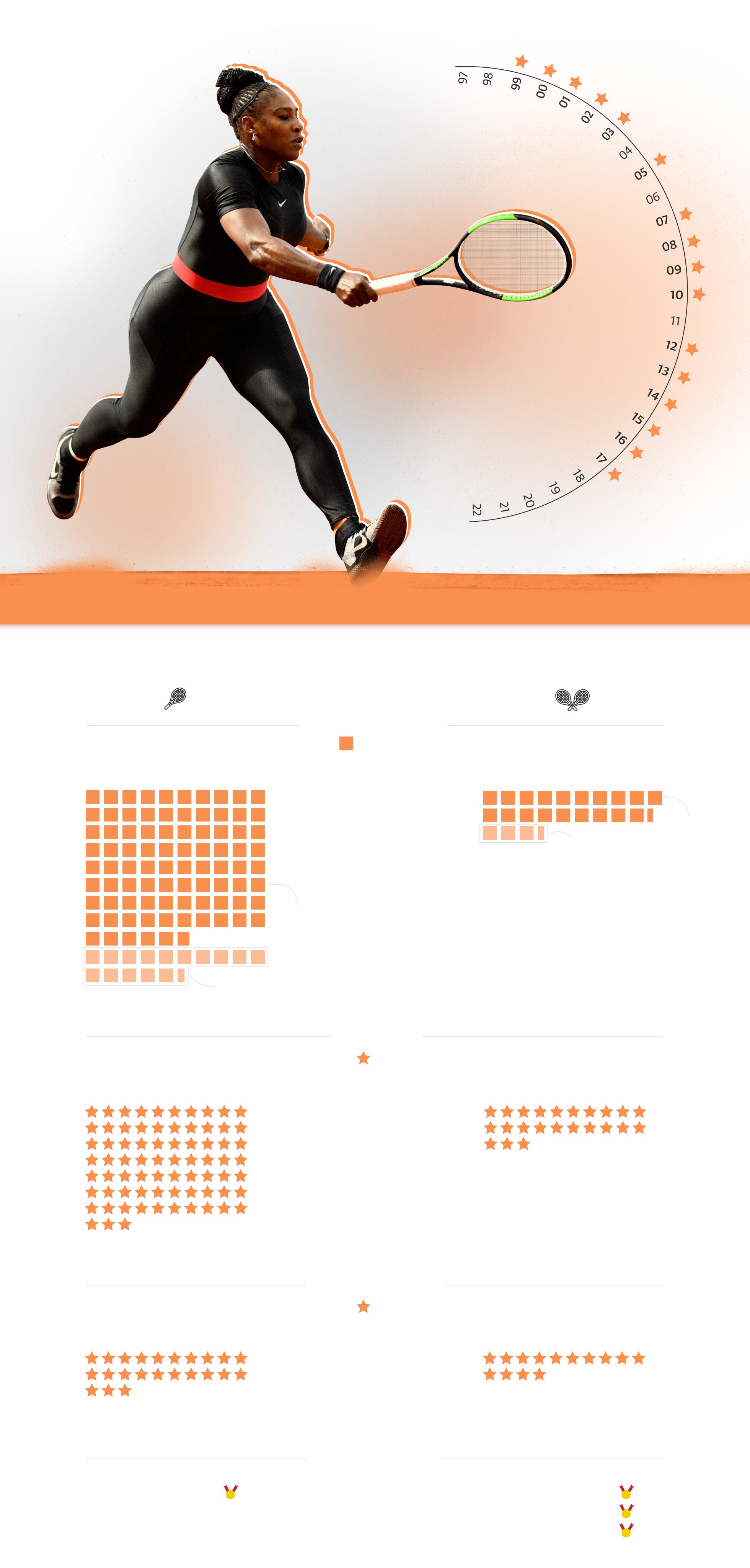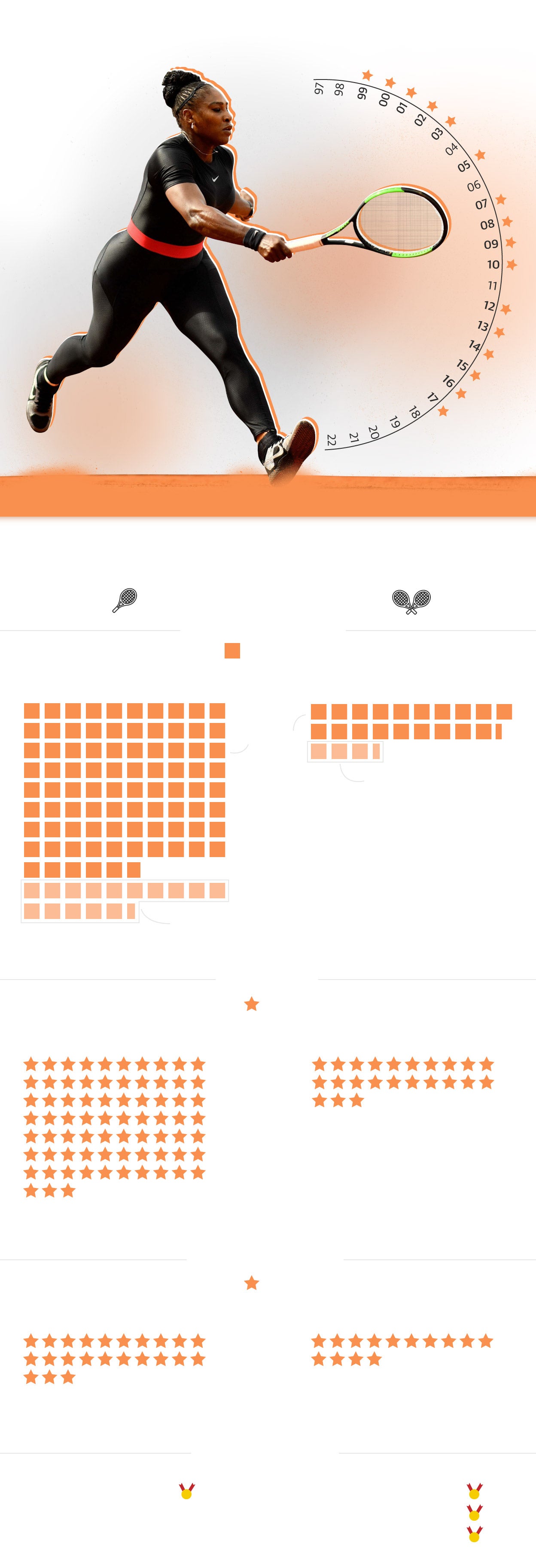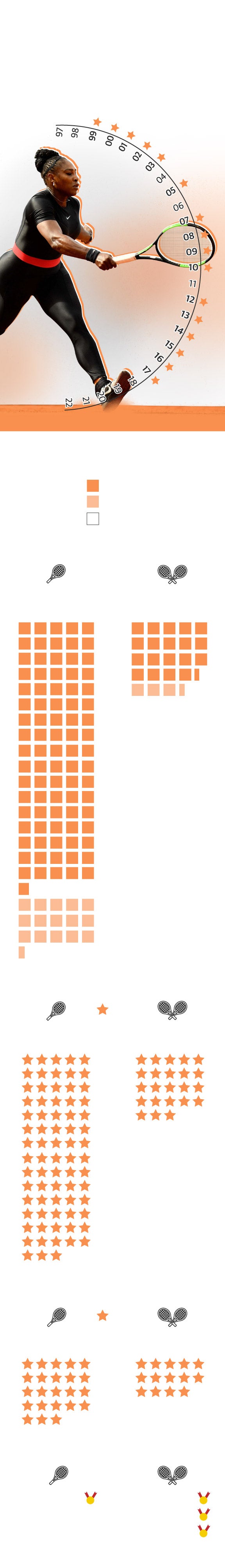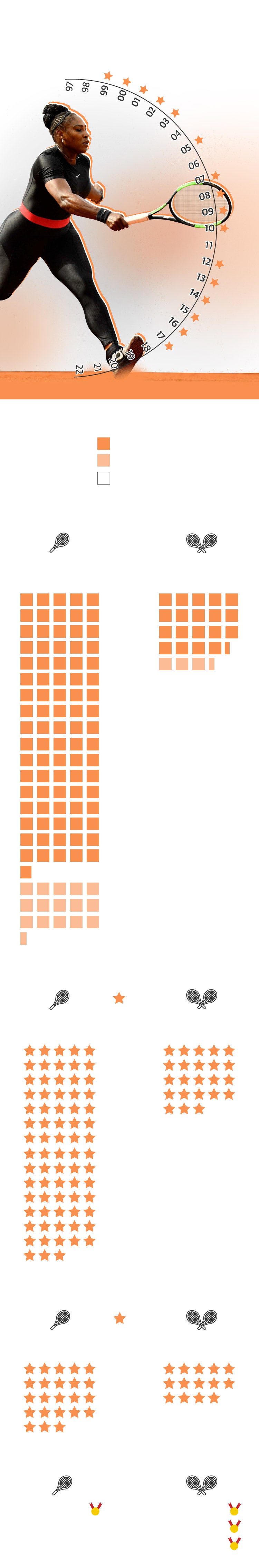Veintisiete años después de dar el salto al profesionalismo, Serena Williams pone fin a su carrera en las pistas con la espina clavada de no haber podido alcanzar a la australiana Margaret Court como la tenista con más trofeos del Grand Slam. El Abierto de Australia de 2017 fue el último grande que pasó a engrosar sus vitrinas. Meses después, anunciaba su embarazo, poniendo en pausa su trayectoria deportiva. Cuatro meses después de dar a luz, volvió a las pistas para medirse a Jelena Ostapenko en un torneo de exhibición en Abu Dabi, pero la maternidad le pasó factura y nunca volvió a ser la misma. Pese a ello, en 2018 y 2019 alcanzó las finales de Wimbledon y del US Open, siendo incapaz de asaltar el trono de Margaret Court.