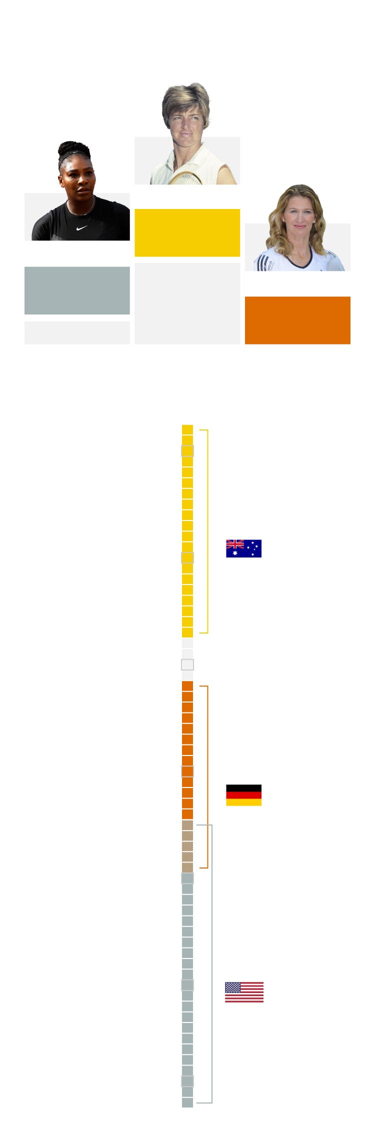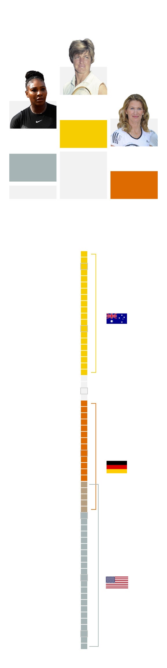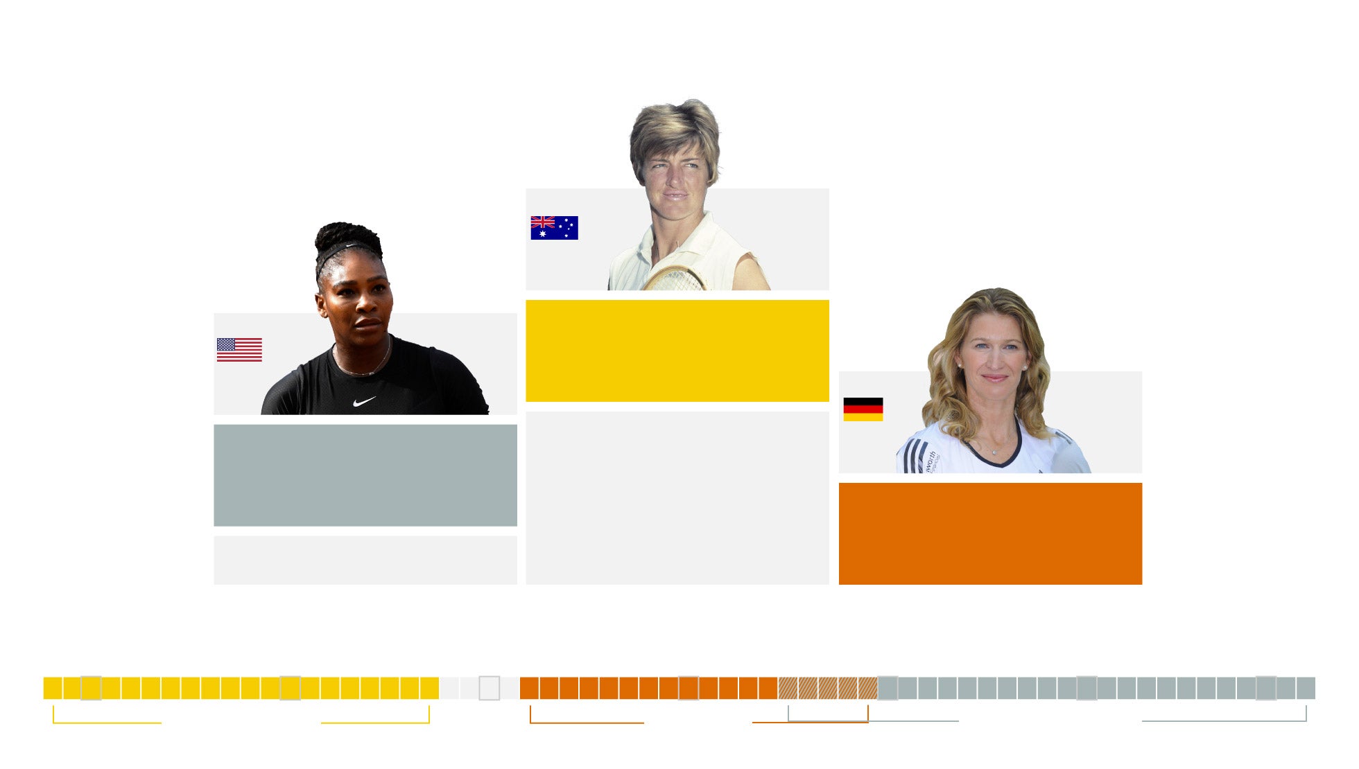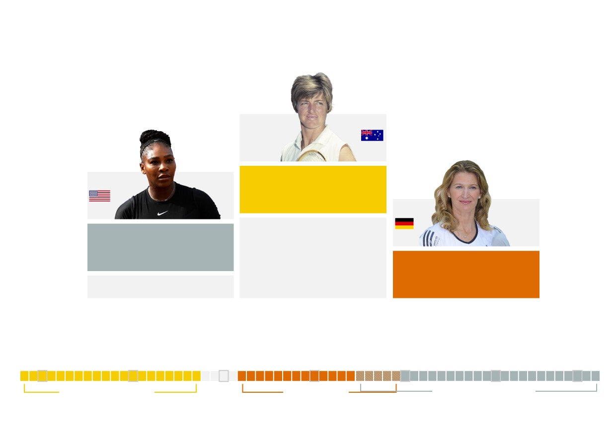 Veintisiete años después de dar el salto al profesionalismo, Serena Williams pone fin a su carrera en las pistas con la espina clavada de no haber podido alcanzar a la australiana Margaret Court como la tenista con más trofeos del Grand Slam. El Abierto de Australia de 2017 fue el último grande que pasó a engrosar sus vitrinas. Meses después, anunciaba su embarazo, poniendo en pausa su trayectoria deportiva. Cuatro meses después de dar a luz, volvió a las pistas para medirse a Jelena Ostapenko en un torneo de exhibición en Abu Dabi, pero la maternidad le pasó factura y nunca volvió a ser la misma. Pese a ello, en 2018 y 2019 alcanzó las finales de Wimbledon y del US Open, siendo incapaz de asaltar el trono de Margaret Court.