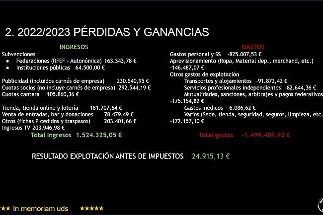 El club salmantino completa su décima temporada consecutiva -todas las de su existencia, con números verdes. Es decir, son superávit. El curso 22-23 lo cierra con +24.915,13€ de superávit, «para un total acumulado de 82.549,99€. A eso habría que sumarle una subvención del CSD pendiente por valor de 58.839,31€», explica la entidad. Esta gestión quedó aprobada por el 99,27% de los socios que votaron.