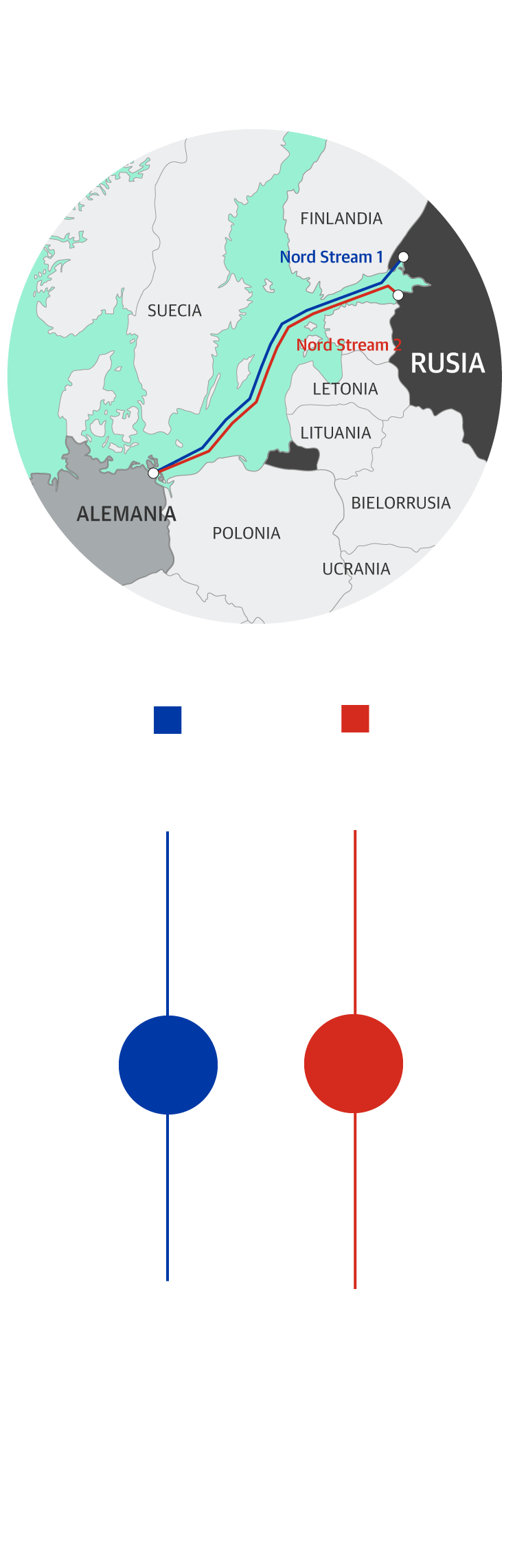 Si de cordones umbilicales se trata, el del Nord Stream es el gran punto de conexión que tantos quebraderos de cabeza ha provocado en los últimos años en la relación entre Alemania, la UE, la propia Rusia... Y hasta Estados Unidos. Por ahora, el canciller actual, Olaf Scholz, ha decidido paralizar la última parte del proyecto, la puesta en marcha del gasoducto paralelo que iba a más que duplicar la capacidad de llegada de gas ruso a Alemania, vía Báltico, sin mediar ningún otro territorio. La cuestión es de tal calibre que hasta llegó a colarse en las discusiones sobre las sanciones a Moscú. Para Washington, el hecho de que Rusia pudiera acceder directamente a territorio alemán en mayor proporción nunca fue bien visto.