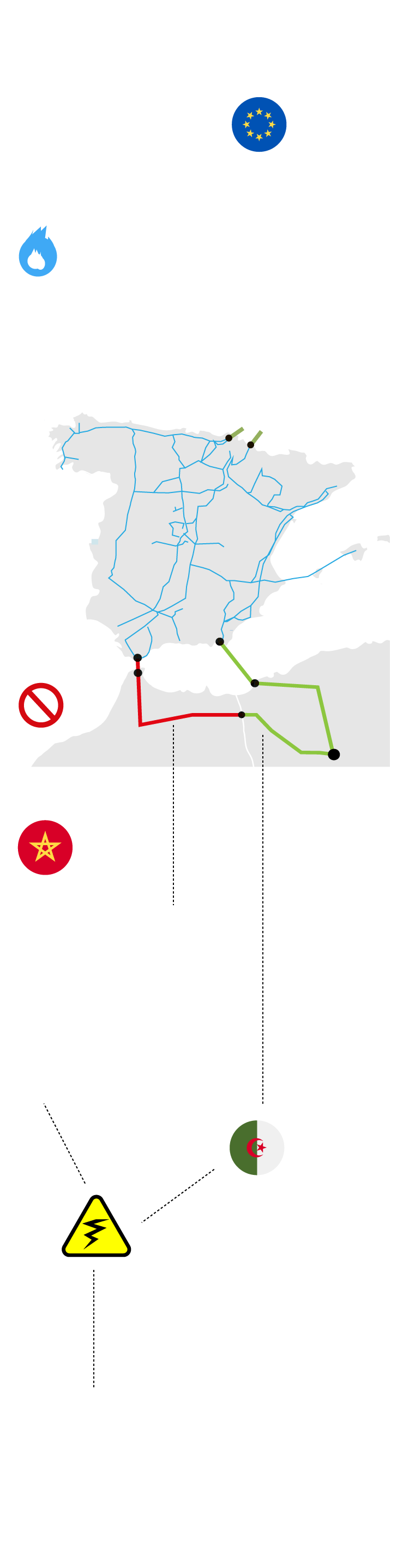 Magreb-Europa (Argelia/Marruecos/Tarifa: Tiene una capacidad de 9.000 millones de m3 al año. Desde el 31 de octubre de 2021, se encuentra cerrado ante la ruptura de relaciones diplomáticas de Argelia con Marruecos