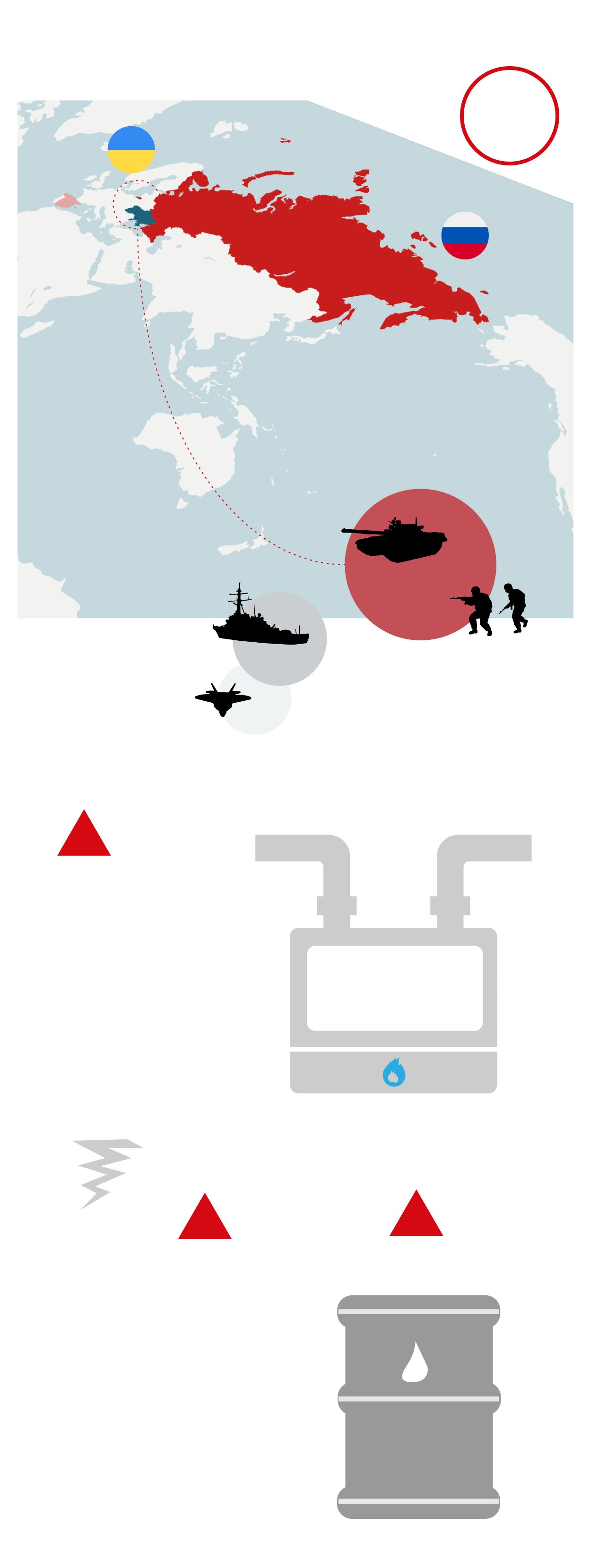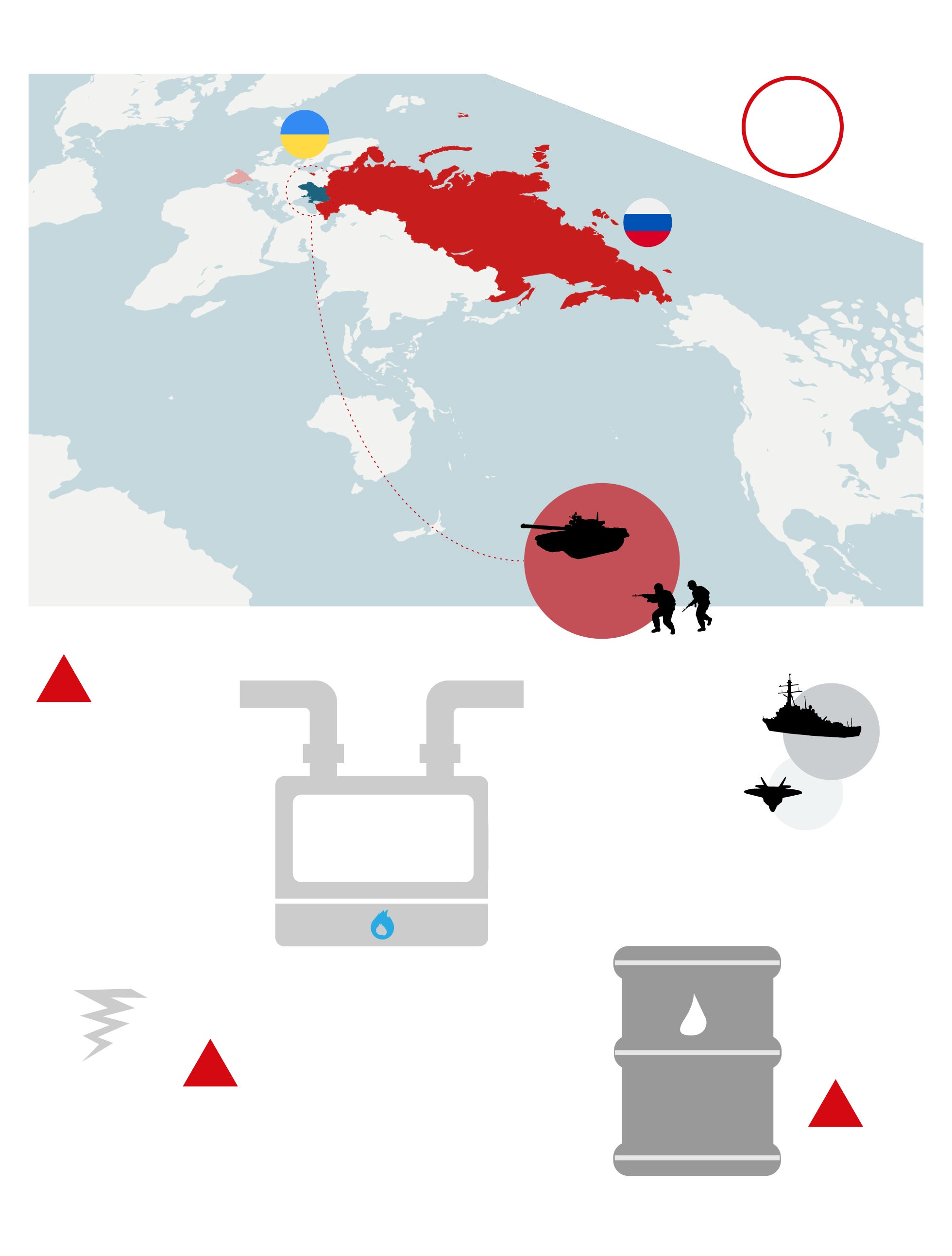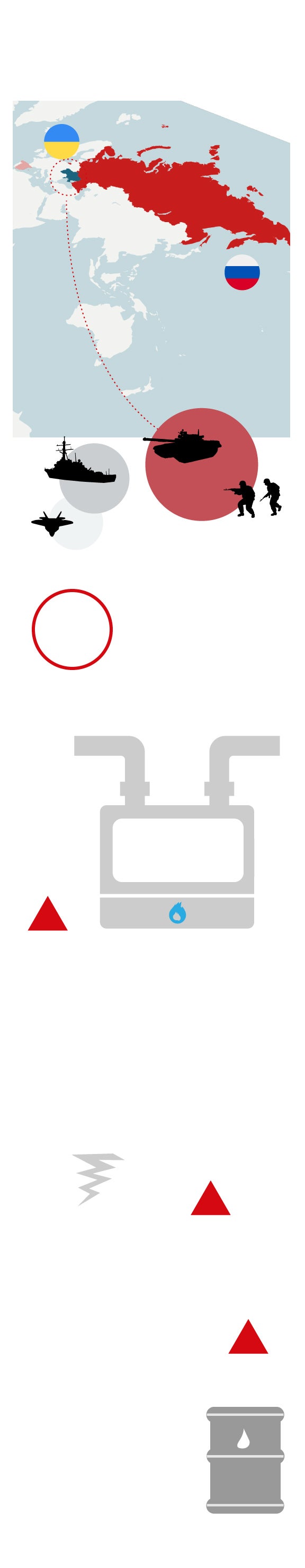 Los primeros efectos se dejaron sentir a las pocas horas de que la noche del 24 de febrero las tropas rusas invadieran parte del Este y del Norte de Ucrania, para aproximarse a Kiev. El termómetro de los precios se disparó: el coste del gas en el mercado internacional se desbocó un 60% en apenas unas horas. Los repuntes de esta materia prima ya venían de lejos, desde hace casi un año, aunque fue a raíz de la invasión cuando superó todos sus récord. El efecto fue inmediato en el precio de generar electricidad: en pleno invierno, ante la necesidad de usar los ciclos combinados propulsados con gas, el coste de la luz también se disparó. Y el petróleo, el tercer elemento en discordia, no se quedó atrás, con alzas históricas. En el trasfondo, el papel relevante de Rusia, de donde llega un 40% del gas del que se abastece Europa y la mitad del petróleo que consumen los europeos.