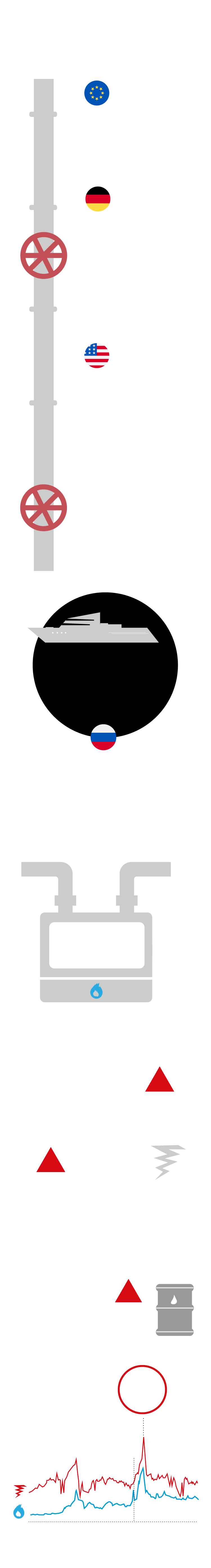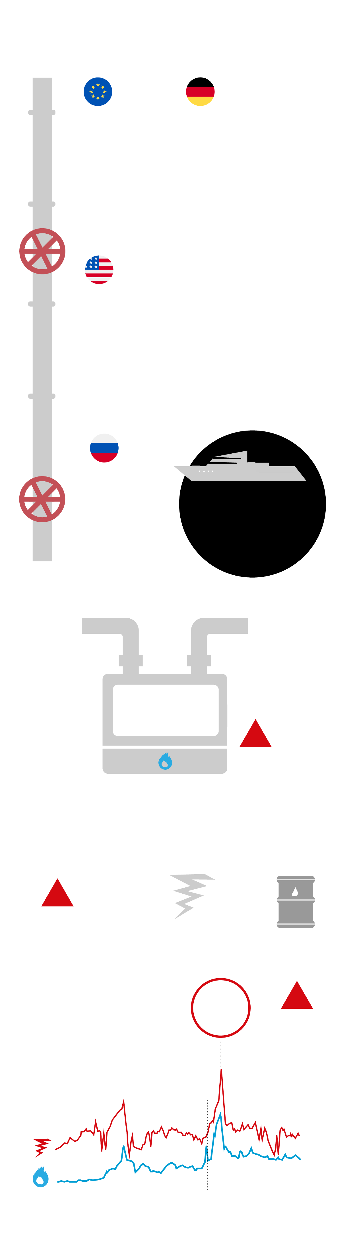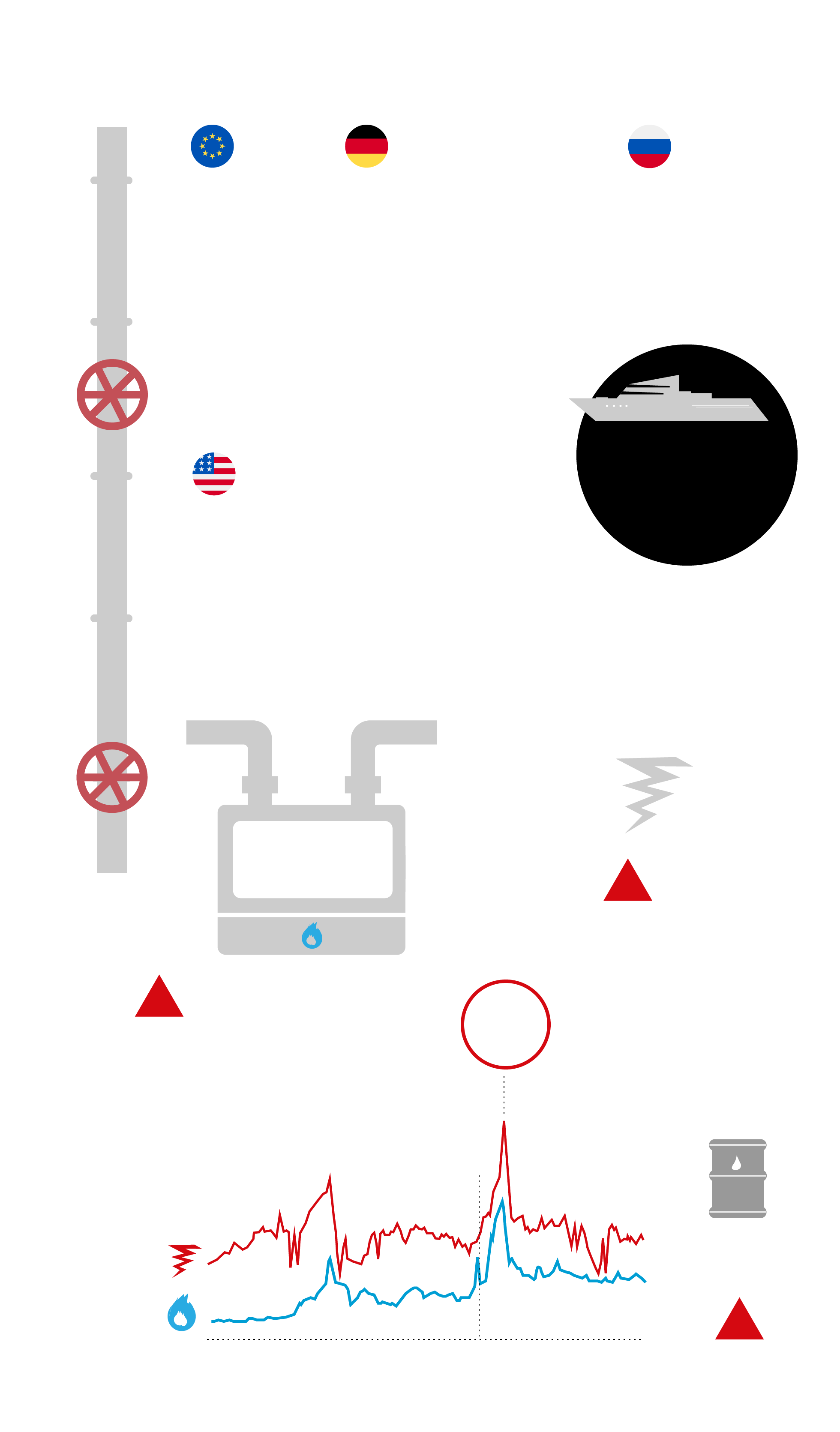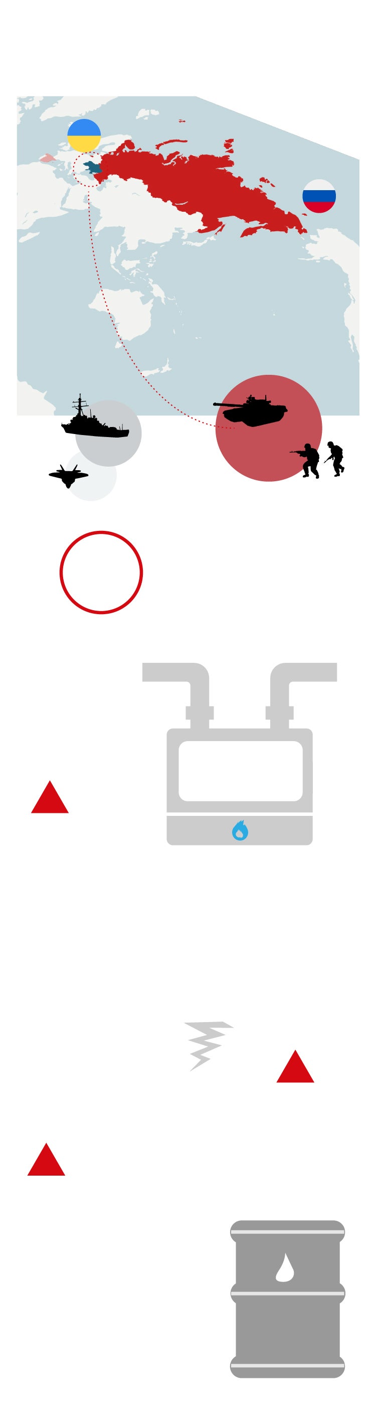 Los primeros efectos se dejaron sentir a las pocas horas de que la noche del 24 de febrero las tropas rusas invadieran parte del Este y del Norte de Ucrania, para aproximarse a Kiev. El termómetro de los precios se disparó: el coste del gas en el mercado internacional se desbocó un 60% en apenas unas horas. Los repuntes de esta materia prima ya venían de lejos, desde hace casi un año, aunque fue a raíz de la invasión cuando superó todos sus récord. El efecto fue inmediato en el precio de generar electricidad: en pleno invierno, ante la necesidad de usar los ciclos combinados propulsados con gas, el coste de la luz también se disparó. Y el petróleo, el tercer elemento en discordia, no se quedó atrás, con alzas históricas. En el trasfondo, el papel relevante de Rusia, de donde llega un 40% del gas del que se abastece Europa y la mitad del petróleo que consumen los europeos.