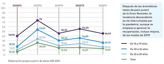 En los años posteriores se observó una mejora paulatina (a excepción de los datos para 2020 con la crisis de la Covid-19) hasta llegar a reflejar en el primer trimestre de 2022 un 46,4 % de paro para los y las más jóvenes, un 26,7% para el grupo intermedio y un 18,3 % para los y las jóvenes de más edad; aún lejos de la tasa de paro general del 13,6 %. Como vemos, a pesar de la mejora relativa en los últimos años no hemos llegado a alcanzar niveles inferiores a los registrados antes de la crisis de 2008.