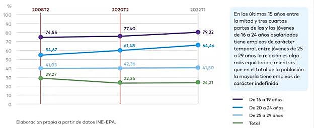 2. Por lo que respecta a la tasa de temporalidad, en los últimos 25 años entre el 69 % (2009) y el 93 % (2014) de las y los jóvenes de 16 a 19 años asalariados eran temporales. Algo inferiores son las cifras de temporalidad de jóvenes entre 20 y 24 años, entre el 50 % (2009) y el 74% (2016); y entre el 36,9 % (2009) y el 49,8 % (2017) de jóvenes de 25 a 29 años.