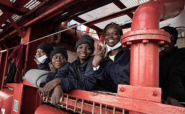 Migrantes rescatados en el Mediterráneo se preparan para embarcar en el Ocean Viking. AFP