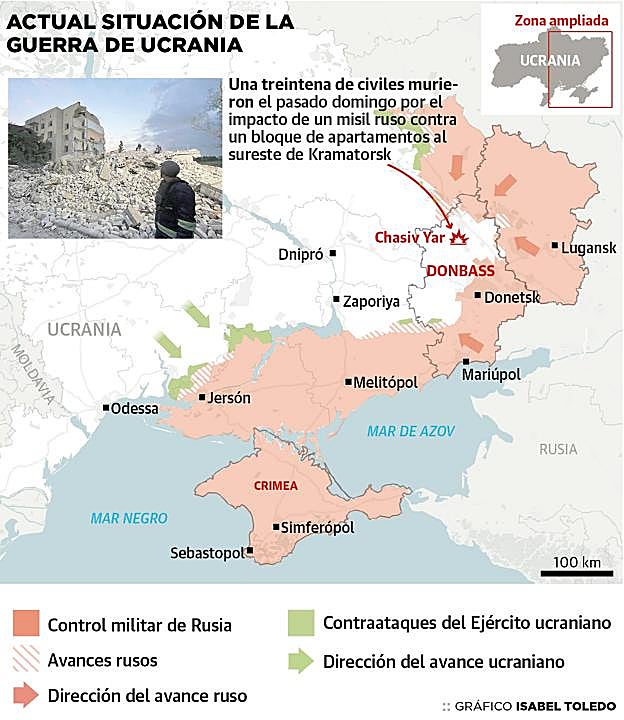 Pero, aunque el objetivo principal declarado del Kremlin es la ocupación de todo Donbass, lo cierto es que, según el Estado Mayor del Ejército ucraniano, las tropas rusas están bombardeando también Járkov, Odessa, Mykolaiv, Krivói Rog, Dnipró y otros puntos del centro y sur del país, lo que indica que hay planes mucho más amplios en dirección al oeste. Ayer, por ejemplo, Járkov volvió a ser alcanzada por las bombas. El máximo responsable administrativo de la región, Oleg Sinegúbov, dio cuenta de tres muertos y 28 heridos, entre ellos un niño de cuatro años y un adolescente de 16, en un nuevo ataque de la artillería rusa perpetrado con lanzaderas múltiples de cohetes en la noche del domingo. El asesor presidencial ucraniano, Oleksiy Arestóvich, cree que Moscú no ha renunciado a su idea inicial de ocupar Járkov y no descarta que las fuerzas rusas que están siendo desplegadas al norte de la ciudad terminen lanzándose al asalto en cualquier momento.