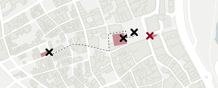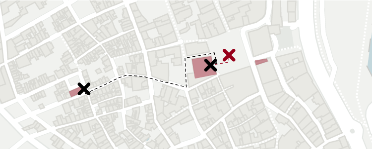 El sacristán huye fuera del templo, pero tropieza en la cercana Plaza Alta. Tras caer el religioso al suelo, el agresor le apuñala mortalmente varias veces al tiempo que le golpea.