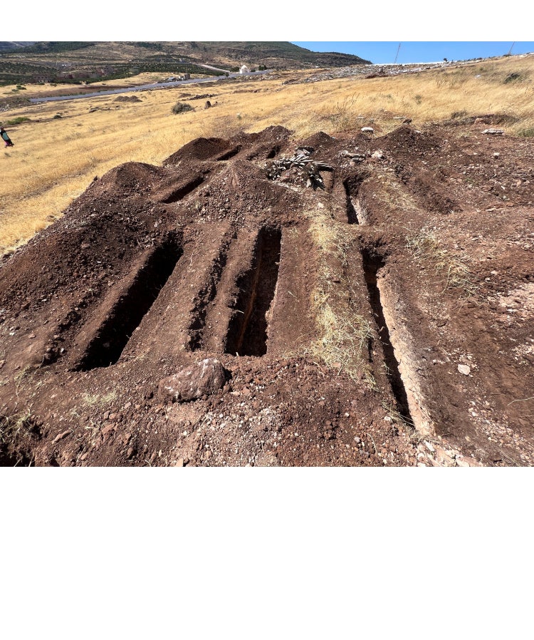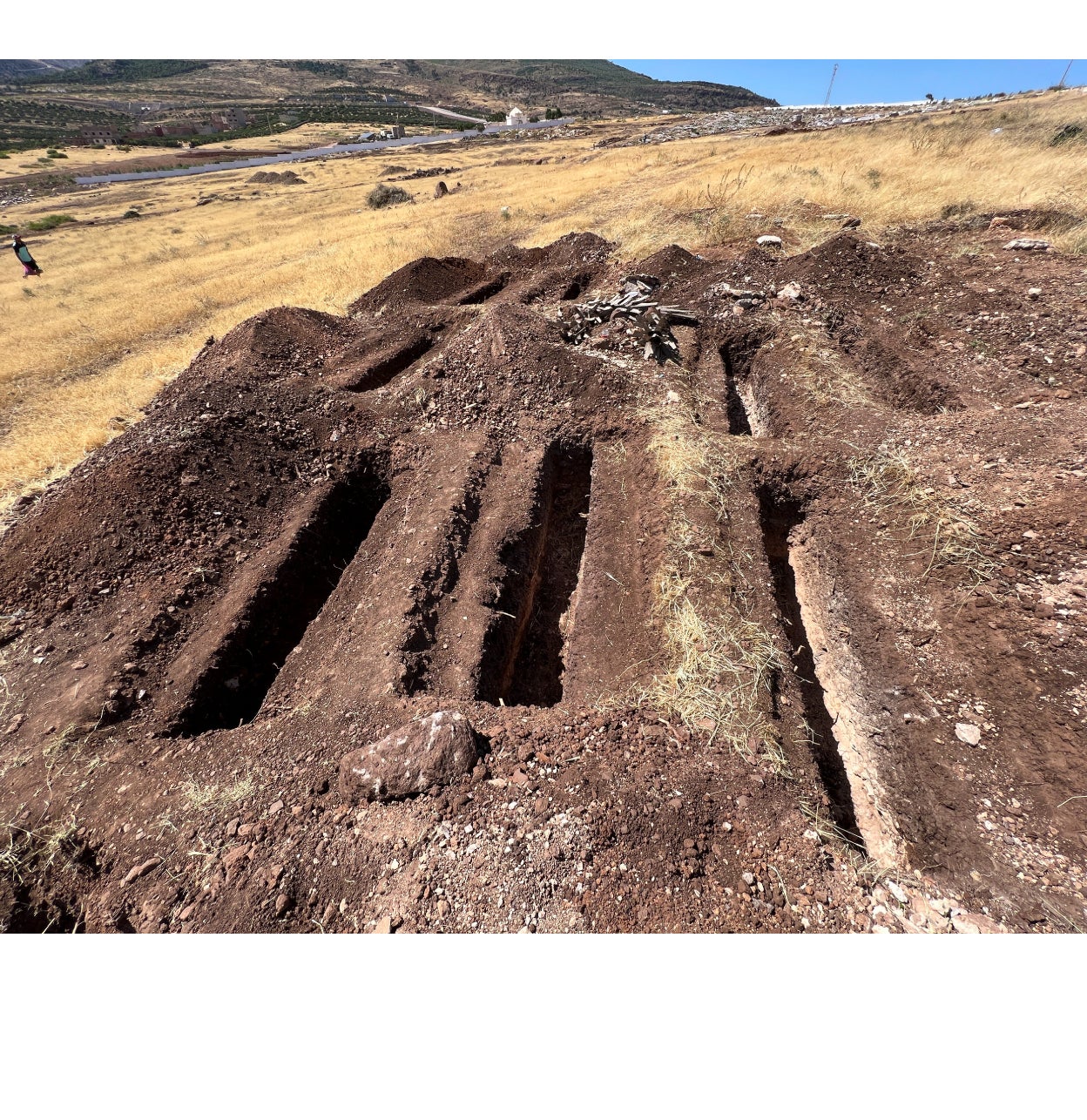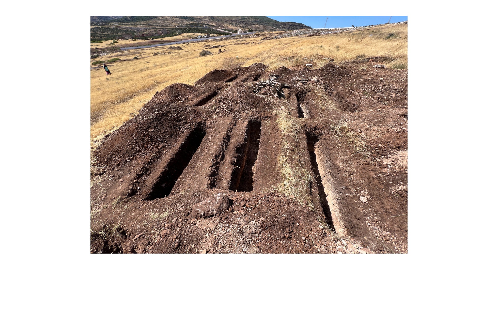 Ya el 26 de junio, dos días después del salto, operarios del cementerio de Sidi Salem, en las afueras de la localidad marroquí de Nador, preparaban varias fosas donde las autoridades planeaban enterrar a los migrantes muertos. EFE/Mohamed Siali