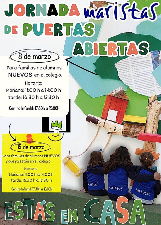 Para aquellas familias de alumnos nuevos en el centro, Colegio Marista ha organizado una jornada de puertas abiertas para el 8 de marzo. El horario sería: de 11:00 a 14:00 y de 16:30 a 18:30 horas. Y para el Centro Infantil, de 17:30 a 18:30.