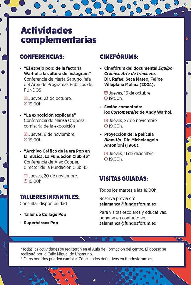 El pop art es la propuesta cultural que esta temporada expone FUNDOS en el Centro Cultural Fundos Fórum Salamanca. Andy Warhol, Banksy, Annie Leibovitz y Keith Haring son algunos de los más de 20 artistas que forman parte de la exposición 'Todo es pop. De Europa a Estados Unidos' que se puede visitar del 13 de septiembre de 2025 al 11 de enero de 2026.