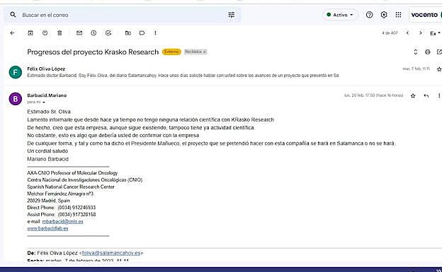 En un correo electrónico, Barbacid se desvincula de la empresa Krasko Research, la sociedad que está detrás de la iniciativa y a la que fueron dirigidas todas las decisiones administrativas que tomó la Junta. El Gobierno regional decidió declarar el proyecto de interés estratégico para la comunidad y le concedió a la sociedad una subvención de casi 2 millones de euros con la condición de que se instalara en Salamanca y llevara a cabo tanto la investigación como la fase de producción de un proyecto para encontrar tratamientos a cánceres como el de páncreas.