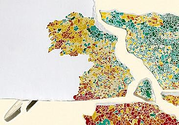 En el mapa inferior, los barrios más afectados por la falta de reemplazo, es decir, zonas donde el número de personas que se jubilan superan o igualan la incorporación de personas a la vida activa. Los contornos más oscuros, los de tres de los barrios del centro histórico al sur de la Plaza Mayor y los del oeste y sur de la capital.