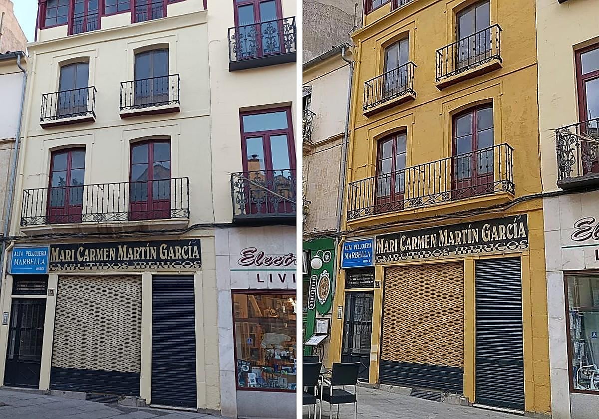 El asunto viene de febrero de 2024 cuando se procede a una actuación en el edificio, que está protegido en el catálogo municipal y se encuentra en un lugar sensible, en pleno centro histórico. Sus propietarios decidieron repintar la fachada y balcones y se le retiró el cartel de una histórica sastrería. El problema es que para la pintura se eligió un tono muy fuerte de amarillo que no era, ni mucho menos, el original.
