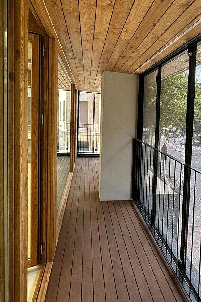 La reforma ha tenido muy en cuenta el compromiso con la sostenibilidad y la eficiencia energética. La nueva envolvente del edificio —con carpinterías de altas prestaciones, contraventanas metálicas practicables y una galería que actúa como cámara de protección— permite reducir la demanda energética en calefacción y refrigeración.