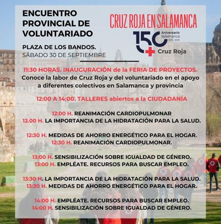 Más de 250 personas voluntarias de Cruz Roja de la capital y de toda la provincia, tanto en activo como otras que han pasado por la organización, acompañadas de familiares, compartirán este sábado una jornada de reencuentros, intercambio de experiencias, convivencia y propuestas lúdicas. El encuentro comenzará con una recepción al voluntariado en el Ayuntamiento de Salamanca con una fotografía de recuerdo en la Plaza Mayor. A las 11:30 horas se inaugurará en la plaza de Los Bandos una gran 'Feria de proyectos' con 15 carpas y dos vehículos donde se mostrará la labor de Cruz Roja en las distintas áreas y con los diferentes colectivos. Una feria que busca sensibilizar a la población sobre cómo la labor del voluntariado logra mejorar la calidad de vida de las personas de nuestro entorno y de nuestra sociedad.
