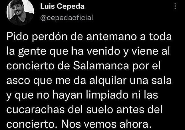 «Pido perdón de antemano a toda la gente que ha venido y viene al concierto de Salamanca por el asco que me da alquilar una sala y que no hayan limpiado ni las cucarachas del suelo antes del concierto», compartía en un tweet.