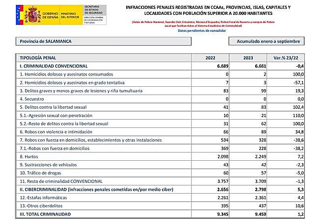 Los datos del Balance de Criminalidad hasta el tercer trimestre de 2023 que publica el Ministerio del Interior presentan datos demoledores sobre la evolución de las infracciones penales en la provincia y en la capital salmantinas.