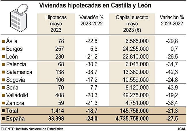 El número de hipotecas registradas sobre viviendas en mayo de 2022 en Salamanca fue de 225, mientras que este mes de mayo han caído a solo 138. El porcentaje de Salamanca es el más bajo de toda la región y solo se le acerca Palencia con un -30,61%.