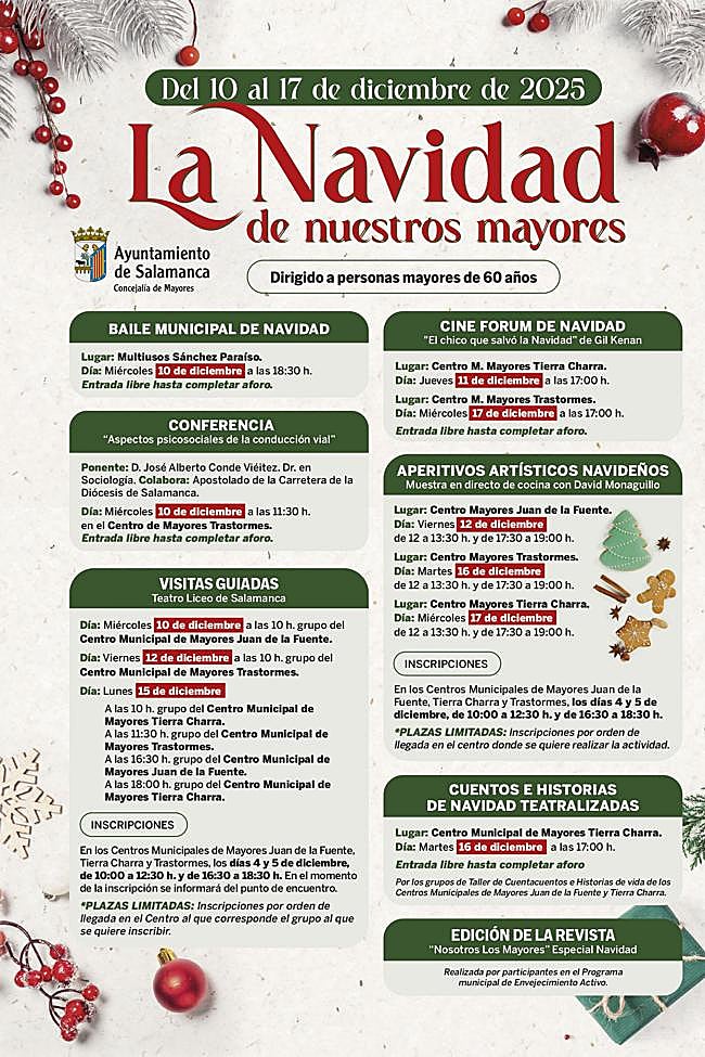 El Ayuntamiento de Salamanca abre los días 4 y 5 de diciembre el plazo de inscripción de las actividades municipales de Navidad con plazas limitadas destinadas a personas mayores de 60 años. En concreto, se requiere inscripción previa para participar en las visitas guiadas al Teatro Liceo los días 10, 12 y 15 de diciembre, y los talleres de cocina en directo que impartirá David Monaguillo los días 12, 16 y 17 de diciembre en los centros municipales de mayores Juan de la Fuente, Trastormes y Tierra Charra, respectivamente.