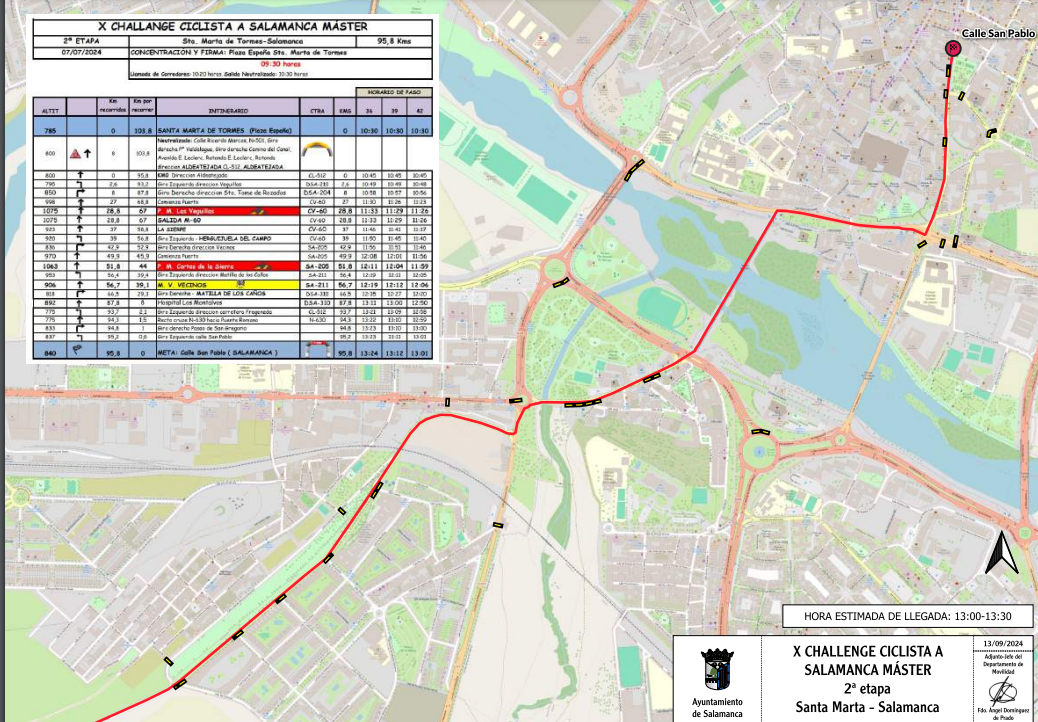 Varias calles de la ciudad se verán afectadas durante la mañana de este domingo, 15 de septiembre, debido a la celebración de dos eventos deportivos. En concreto, la X Challenge Ciclista a Salamanca Máster dejará cortes y desvíos de tráfico desde las 13:00 a las 13:30 horas, aproximadamente, en las calles Cordel de Merinas, Vilar Formoso, Aveiro, Viseu, Almeida, Estaño, Guarda, Lasalle, Buenaventura, Larga, plaza de Poniente, glorietas de los Milagros, Charrería y Vettones y Vacceos, avenida Reyes de España, paseo del Rector Esperabé, calles Juan de la Fuente y San Pablo y plaza de Colón.