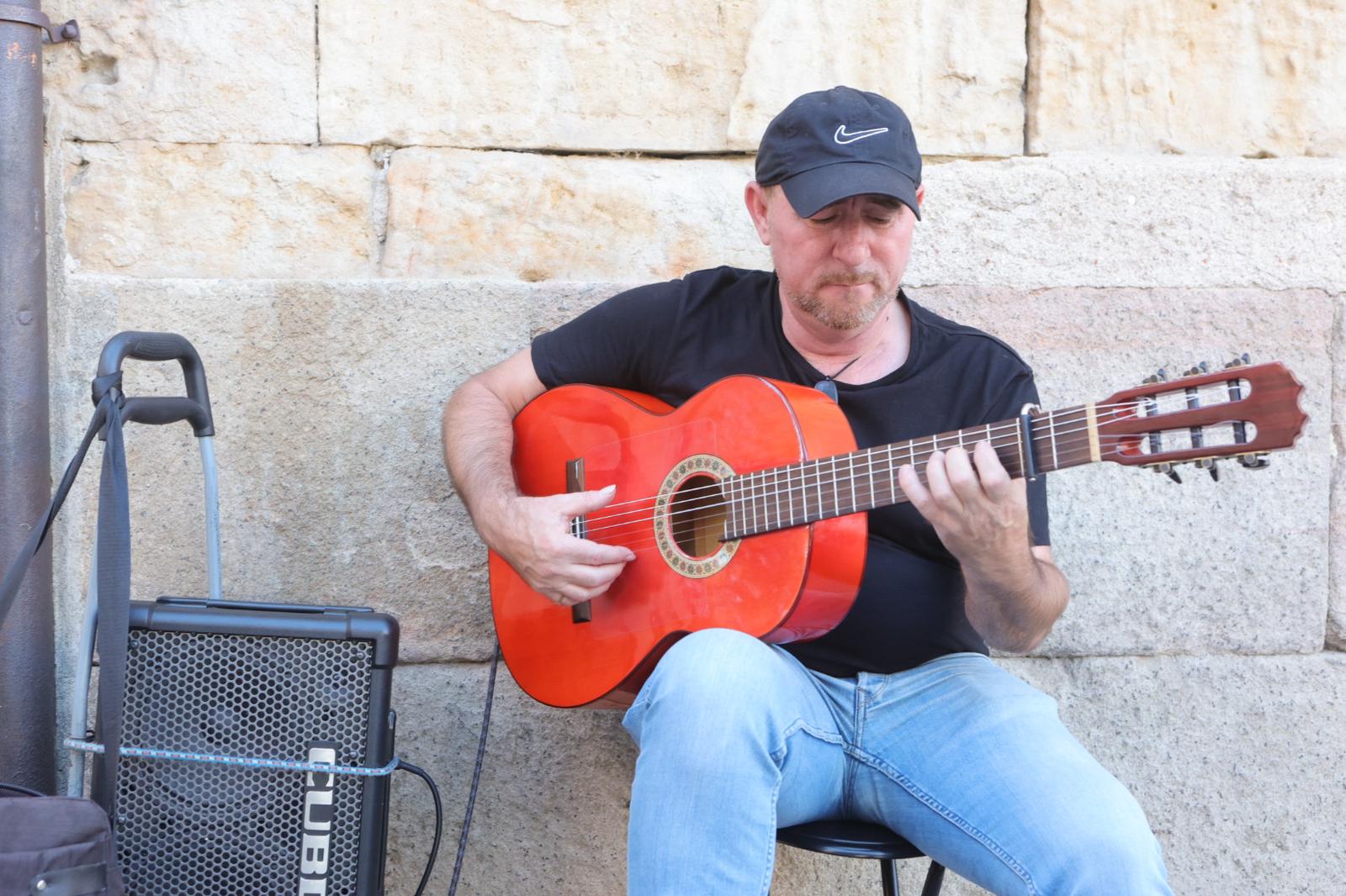 Juan María es un extremeño al que le encanta Salamanca y desde el año 2016 inunda las calles de la ciudad de un sonido nuevo, diferente y envolvente. Su especialidad es la música de los 80, «hago canciones de esa época y las versiono al flamenco». En un primer momento siempre cuesta captar las miradas de quienes pasan por delante de estos artistas pero Juan lo hace enseguida, «comienzo con canciones conocidas, la gente las escucha, las reconoce y ya se queda». Comenta lo agradecido que se siente con la ciudad, «el público de Salamanca es buenísimo y muy generoso, dependiendo del día gano más o menos».