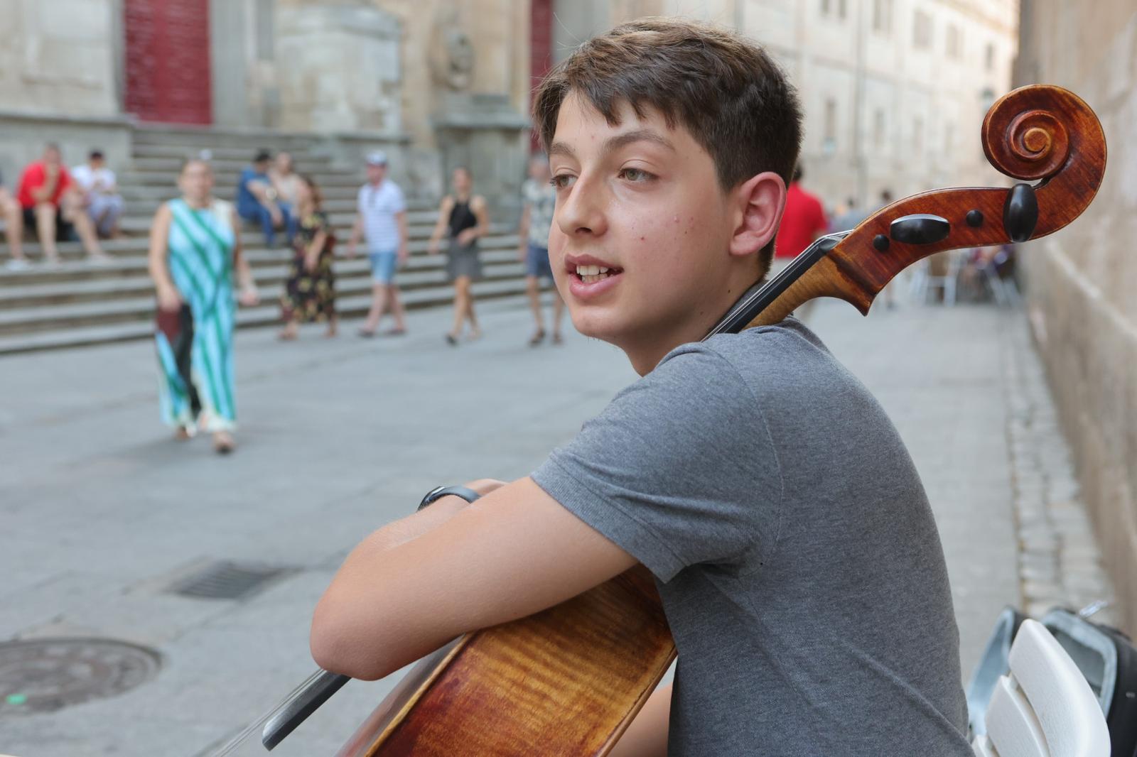 El joven, pese a realizar sus estudios en Madrid, veranea en pueblo cercano a Salamanca y aprovecha las vacaciones de verano para tocar en la capital frente a las miradas de un público «muy generoso». Dar el primer paso siempre es complicado, pero Antonio se lo tomó con total normalidad, «practico muchísimo y pensé en que eso que hago en casa podía hacerlo en la calle y enseñárselo a la gente». Antonio lleva cinco años tocando el violonchelo y 10 el piano, «lo más complicado es empezar pero para llamar la atención aprovecho para tocar mi mejor pieza». Su género es el clásico y la canción que más disfruta en la Tarantella de William Henry Squire.