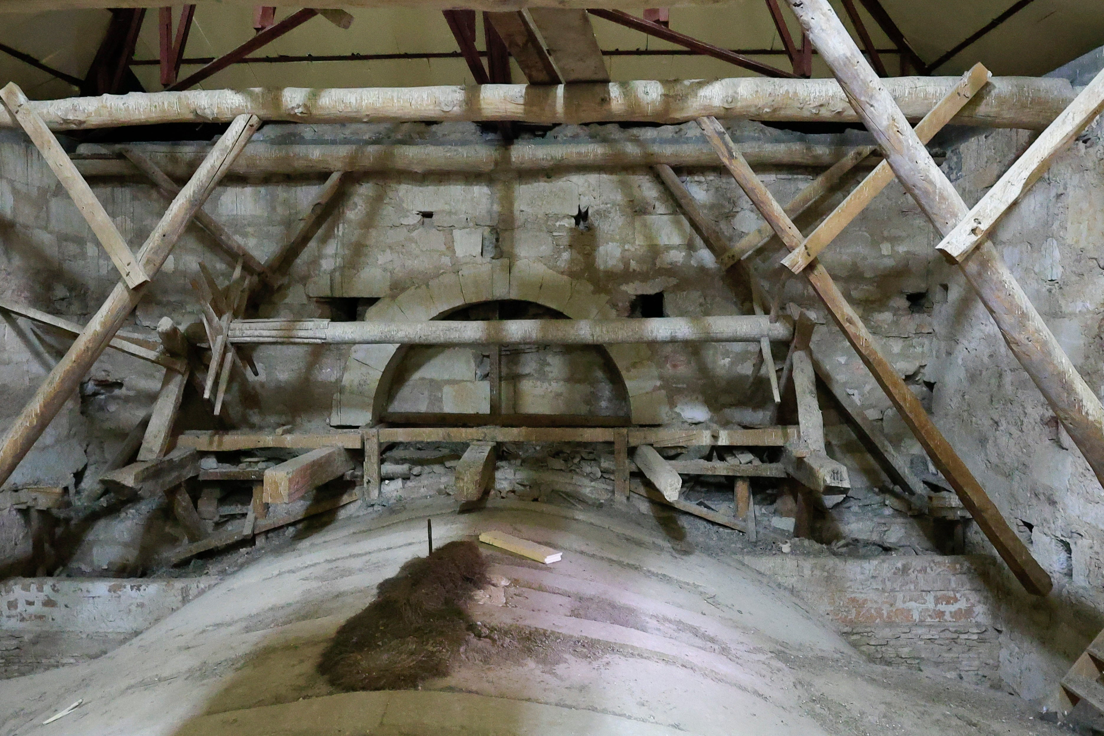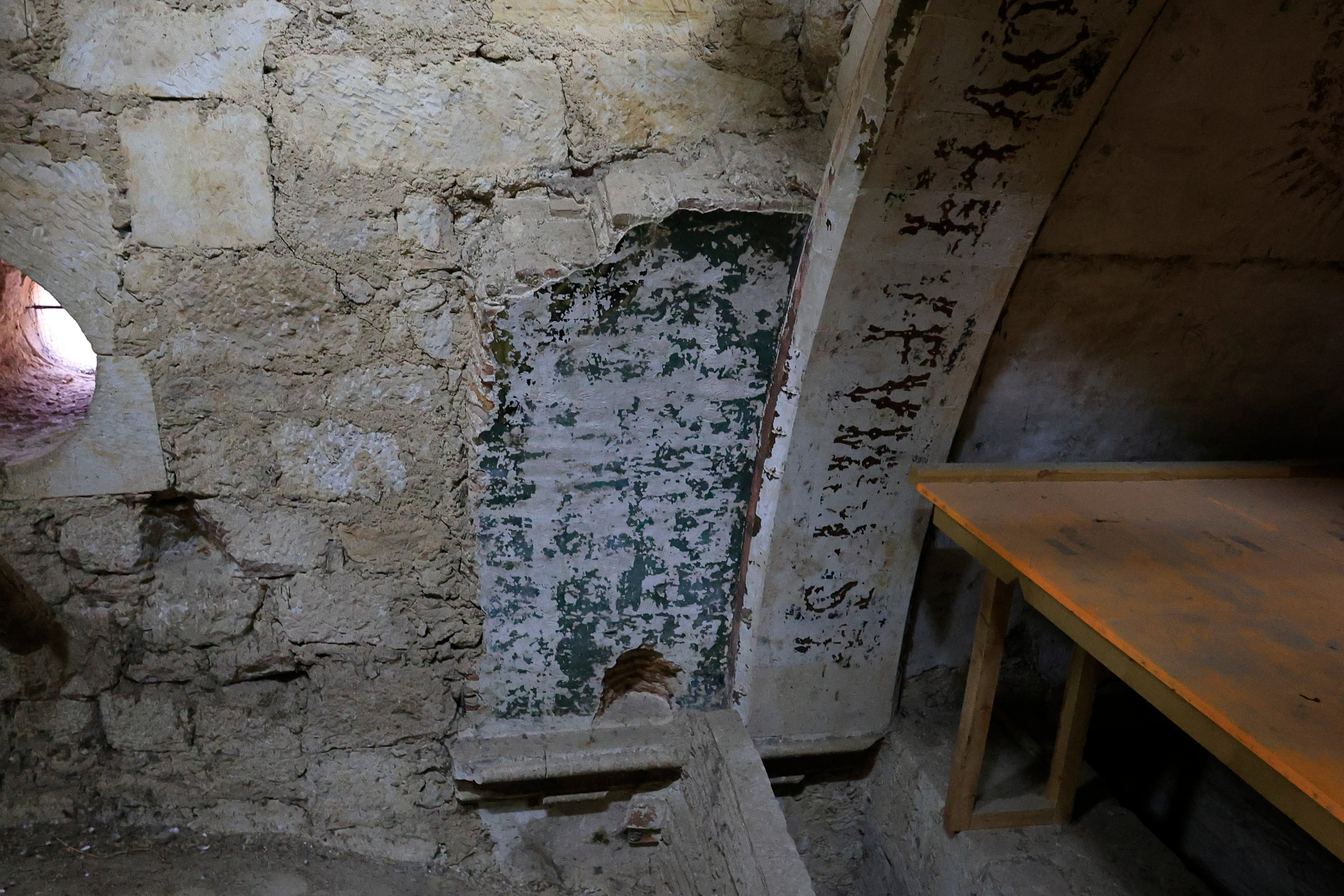 Retrocedemos a la puerta principal y bajamos las escaleras situadas a la izquierda donde descubrimos el interior de la bóveda, de estructura ochavada y formada originalmente por tres cuerpos con bóvedas de cañón, hoy reforzadas con tablas de madera tras un control exhaustivo de humedad y temperatura.