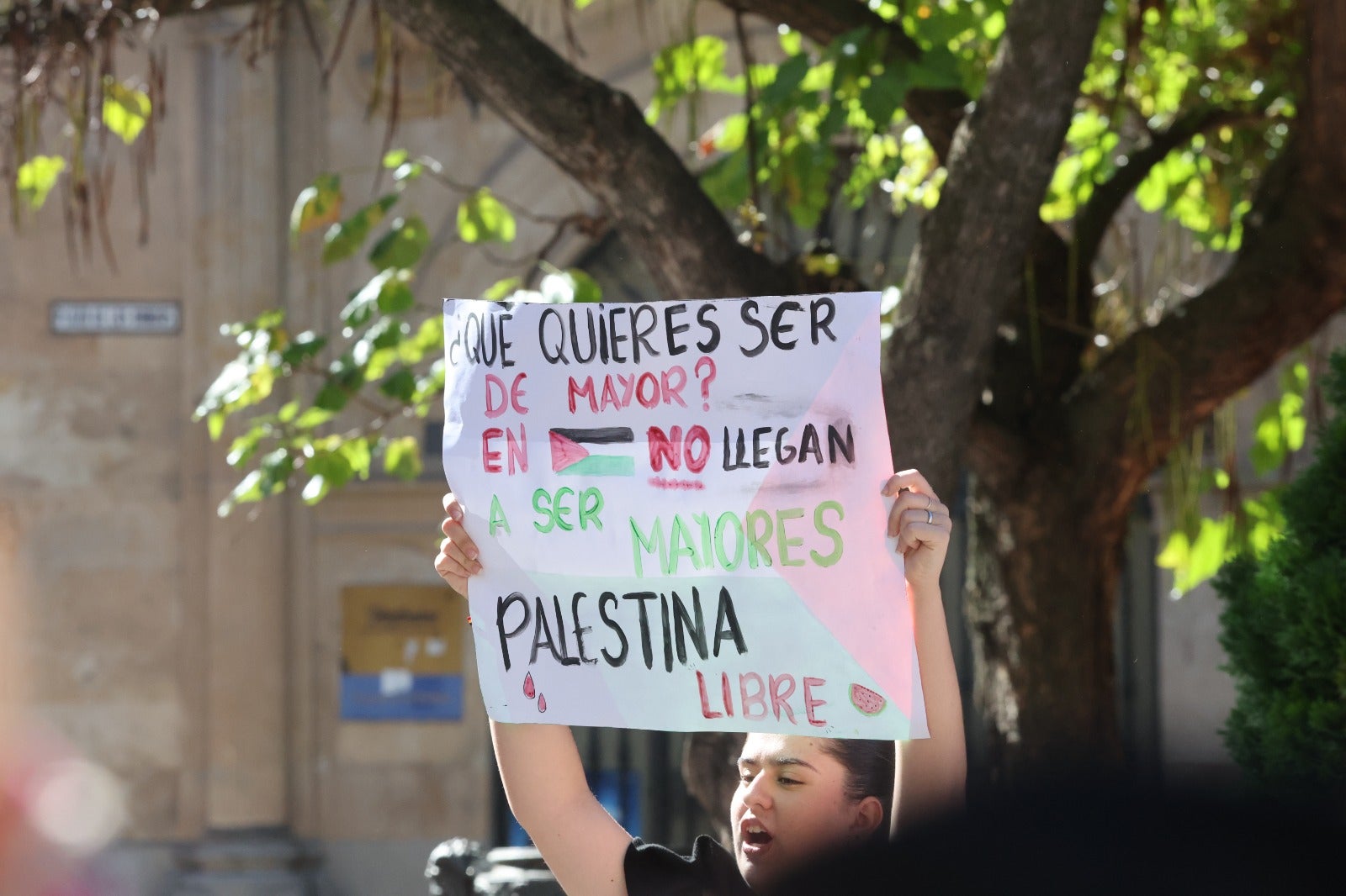 «De norte a sur, de este a oeste, la lucha sigue cueste lo que cueste». Decenas de estudiantes de Salamanca se han manifestado este jueves en la Plaza de los Bandos para alzar la voz contra el genocidio en Gaza y clamar el fin de la guerra. Las banderas de Palestina ondeaban entre la multitud que portaba pancartas denunciando la masacre que está llevando a cabo Israel en la Franja. «¿Qué quieres ser de mayor? En Palestina no llegan a ser mayores» se podía leer en una de ellas.