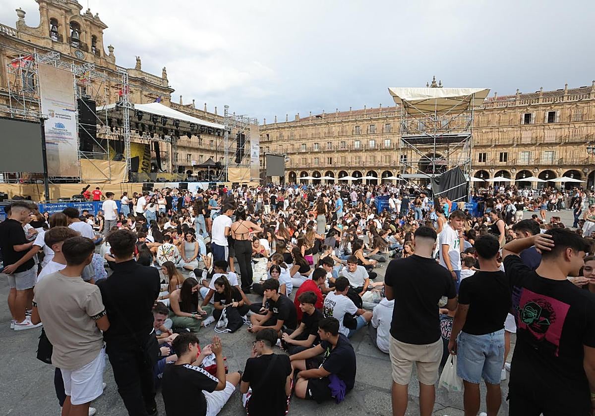 Cientos de jóvenes llenan la Plaza Mayor de Salamanca a falta de cuatro horas para que comience el penúltimo concierto de las Ferias y Fiestas. De hecho, hay quien desde primera hora de la mañana espera para ver aparecer a Juan Magán en el escenario desde la primera fila. Para ello, muchos han tenido que madrugar y renunciar a otros quehaceres para no perderse ni el más mínimo detalle de la actuación. «Hoy no hemos ido a clase porque llevamos aquí desde las 9:00 horas de la mañana», comentaba uno de los grupos que ahora ven cómo se empieza a abarrotar la Plaza Mayor.