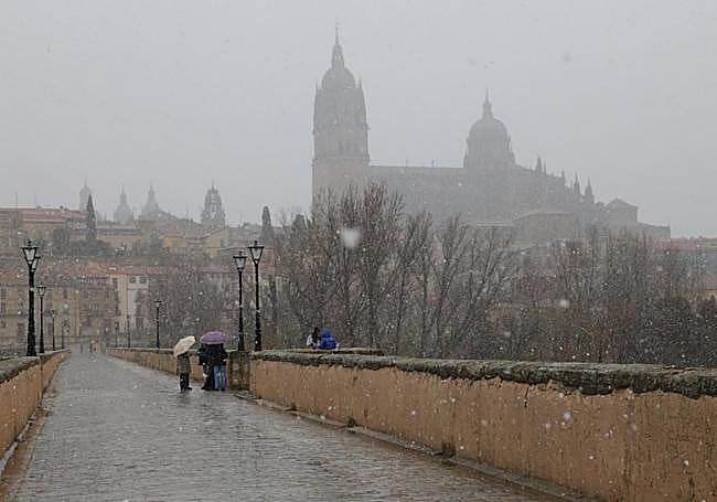 El aviso para Salamanca de la AEMET de este sábado era por vientos fuertes, un sábado que ha contado con intensas lluvias también al mediodía, agua que se ha convertido en nieve a partir de las 15 horas.