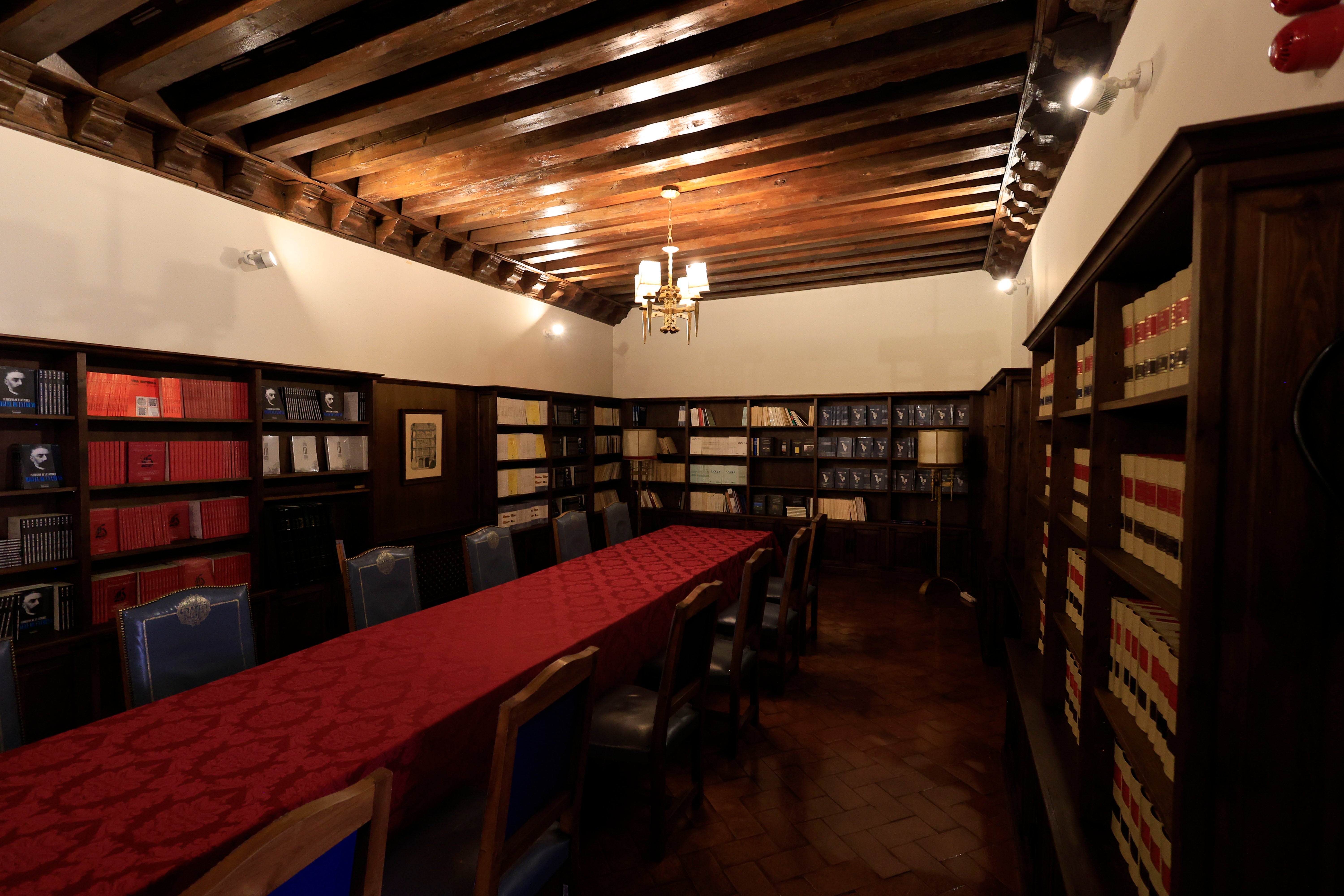 Sala con capacidad para 30 personas, apta para ruedas de prensa, seminarios, reuniones de trabajo, así como comidas y cenas. Conserva un artesonado original y alberga tanto libros antiguos procedentes del propio colegio como otros cedidos por la Universidad.