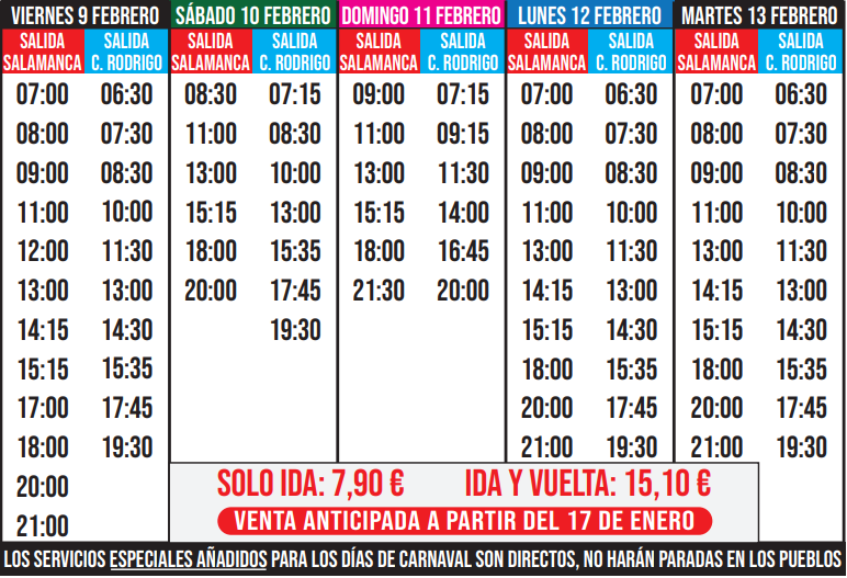 Para este viernes, además de las frecuencias habituales que conectan Salamanca con Ciudad Rodrigo, se añaden otras dos horas más de salida desde la capital: a las 12:00 horas y a las 17:00 horas. Para este mismo día, de la localidad a la ciudad, se añade a la circulación habitual las 11:30 horas. Eso sí, los servicios especiales añadidos para estos días son directos y no harán paradas en los pueblos como sí ocurre en las frecuencias normales.