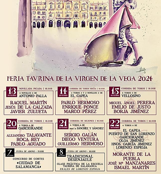 Las Ferias y Fiestas de Salamanca 2024 cada vez están más cerca. Marcan el fin del verano para muchos y después de conocerse los conciertos programados en la Plaza Mayor, además de la pregonera, Silvia Domínguez; se ha desvelado el cartel de la Feria Taurina de la Virgen de la Vega 2024, que contará con ilustres personalidades como Roca Rey, Alejandro Talavante o Enrique Ponce, además de Marco Pérez.