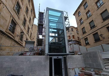 Al nuevo ascensor urbano de Salamanca se le 'caen' los andamios y sus escaleras ya son accesibles
