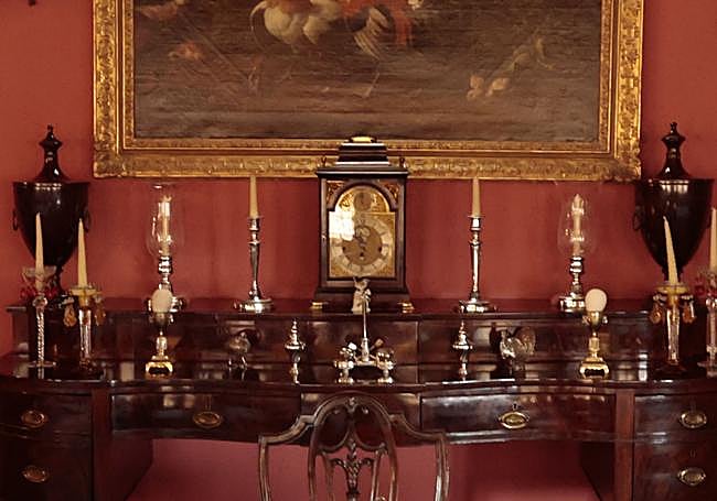 A ambos lados de la mesa se conservan armarios con vajillas inglesas que aún se utilizan, una de ellas de la firma Pickman, de la antigua Cartuja inglesa. Presidiendo la sala, cuelga una peculiar obra del pintor holandés Melchior de Hondecoeter, conocido como «el Rafael de las aves». Una escena cargada de tensión muestra a un ave rapaz saliendo del marco, amenzanado a los polluelos, mientras el gallo y las gallinas intentan defenderlos. Completan la decoración dos tapices flamencos del siglo XVII, tejidos en seda y lana, que representan escenas mitológicas de la diosa de la caza, Diana.