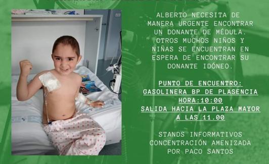 Los familiares del pequeño Alberto han organizado un evento el sábado 14 de enero para promover la donación de médula. Se trata de una marcha solidaria con comienzo en la gasolinera de Plasencia hacia la Plaza Mayor del municipio cacereño. «Alberto necesita de manera urgente encontrar un donante de médula y otros muchos niños y niñas se ecuentran en espera de su donante idóneo», explican en el cartel informativo.