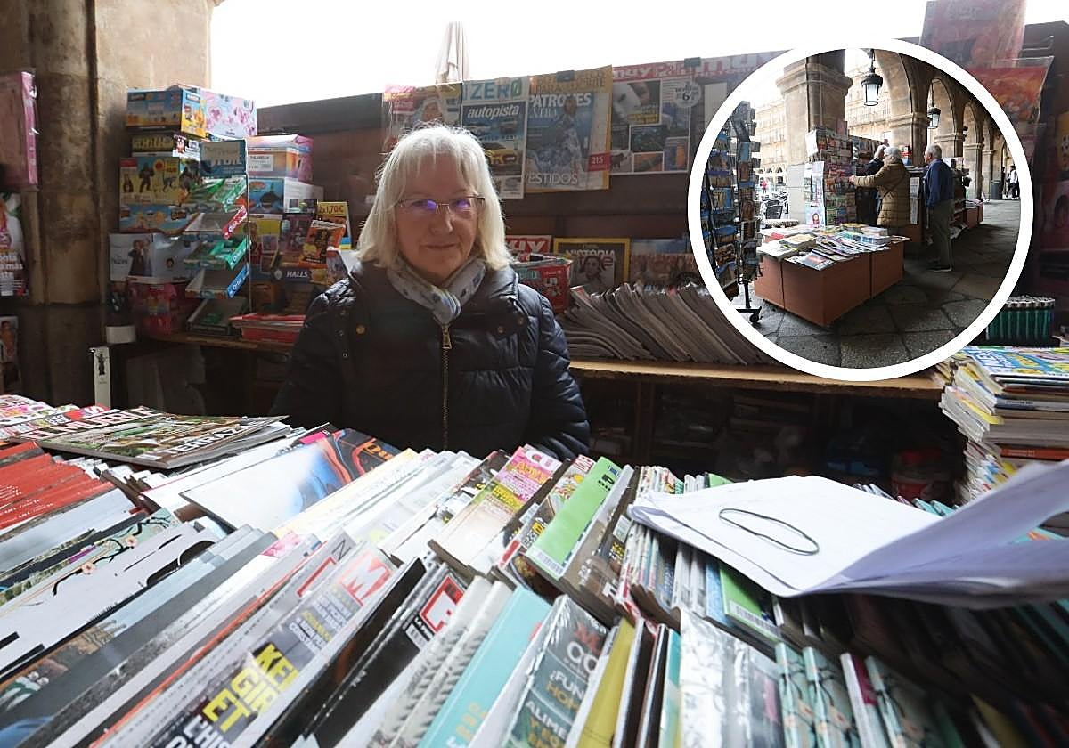 Son las 8 de la mañana de un día de cualquiera. Da igual si es invierno o verano. Da igual si es lunes o domingo. Y también da igual si hace sol o caen chuzos de punta. El quiosco de Dori 'abre' cada día. Aunque no tiene que subir una persiana ni dar la vuelta a una llave porque son diez puertas las que dan entrada a su establecimiento ubicado en la Plaza Mayor. Ese es su «gran privilegio», como ella misma lo define, que las paredes de su negocio sean los soportales del ágora salmantina.