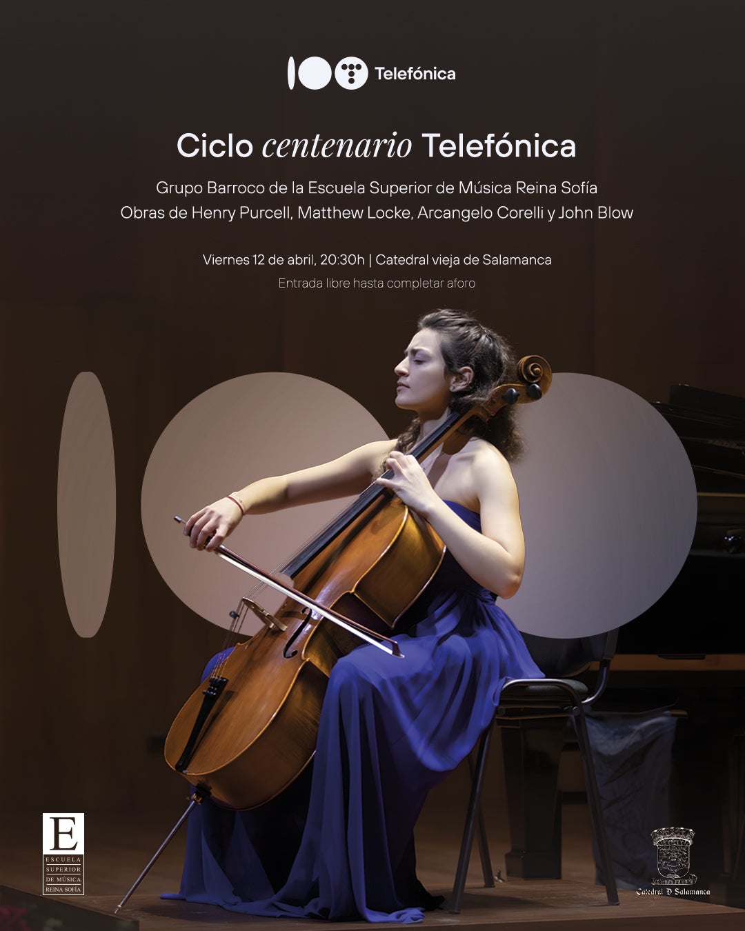 El ciclo de conciertos «Centenario Telefónica», enmarcado en las actividades de conmemoración del 100 aniversario de la empresa, arrancará en Salamanca el viernes 12 de abril a las 20:30 horas, cuando la Catedral Vieja acoja al Grupo Barroco de la Escuela Superior de Música Reina Sofía, integrado por los jóvenes músicos Margherita Brodski, flauta; Sara Zeneli y María Ramos, violines; Mario Carpintero, viola; Guillem Gràcia, violonchelo; Alessandro Spada, contrabajo, y Nicolás Margarit, clave y dirección , quienes interpretarán obras de Henry Purcell, Matthew Locke, Arcangelo Corelli y John Blow.