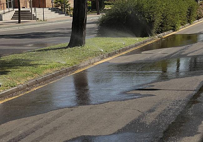Pero no todas las averías o desajustes pasan inadvertidas o tardan por obtener una solución. En la avenida de Alfonso IX de León también el agua salía del parterre y corría cuesta abajo por el asfalto y el problema ya ha sido corregido por la empresa adjudicataria.