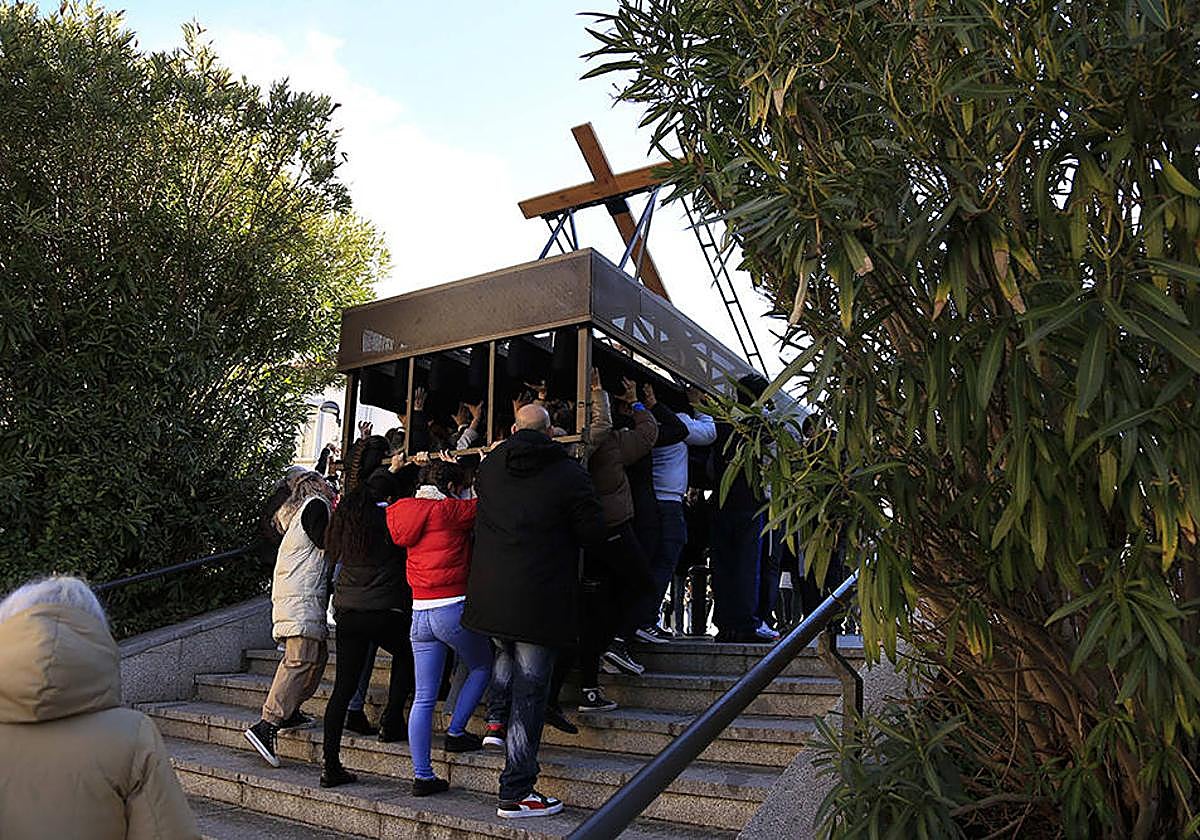 Cuando los kilos que se cargan debajo de un paso no pesan. La Hermandad del Silencio vuelve a realizar su ensayo solidario por las calles de Pizarrales y el barrio Blanco. Tanto los mayores bajo nuevas andas, como los más pequeños con su paso, recorrieron los alrededores de la parroquia de Jesús Obrero para que hermanos y vecinos depositaran alimentos. Se trata de la particular manera que tiene la hermandad de reunir productos para los más necesitados. El solidario andar estaría acompañado por el grupo de tambores de la hermandad.