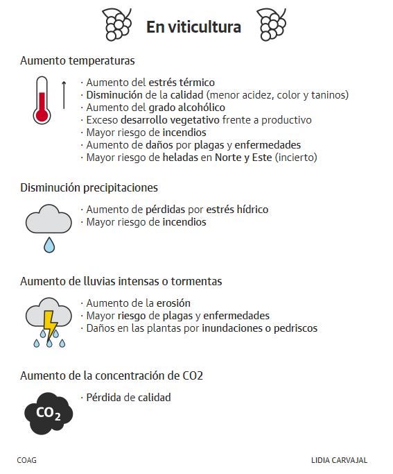 Con estos datos y teniendo en cuenta las temperaturas habituales del verano, se podría decir que este año se ha adelantado un mes y la temporada estival ha comenzado en mayo. Este adelanto del verano no sólo afecta a las personas o a los animales, sino también al campo y en concreto a los viñedos. El calor prematuro que año tras año va reduciendo la primavera ha hecho que la temporada de vendimia también se tenga que adelantar: «Antes empezaba a brotar la viña en mayo, y ahora a mediados de abril. Antes vendimiábamos a mediados o finales de septiembre y acabábamos en octubre, ahora empezaremos a principios de septiembre y seguramente no lleguemos a octubre», comenta Pilar Fernández, directora del Castillo del Buen Amor.