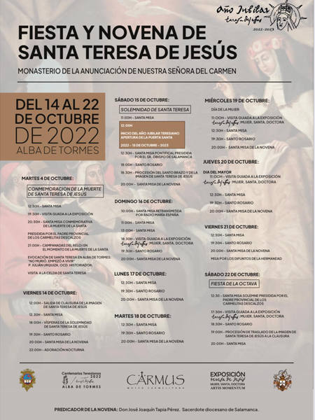 El viernes 21, día de los jóvenes, las actividades darán comienzo a las 10:00 horas, con la tradicional lectura del Libro de las Fundaciones de Santa Teresa que tendrá lugar en la iglesia de San Juan Apóstol junto a la plaza mayor y en la que participarán colectivos, asociaciones y particulares.
