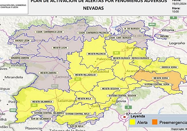 Así, a las zonas que ya se mantenían en alerta - Segovia (Meseta y Sistema Central), Ávila (Sistema Central); y Burgos (Meseta e Ibérica) y Soria (Ibérica y Sistema Central)- se suman las Mesetas de Palencia, Salamanca, Ávila y Valladolid, donde se prevén espesores de nieve de hasta 4 centímetros.
