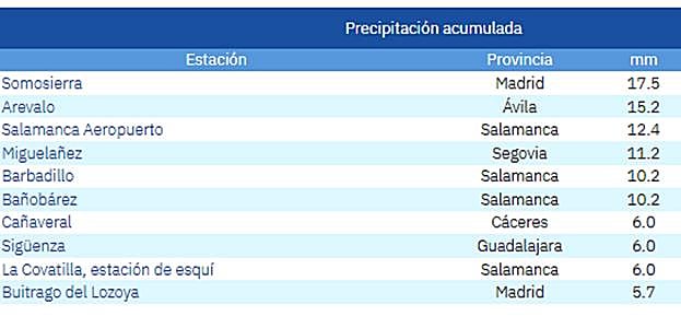 En quinto lugar aparece Barbadillo en Salamanca con 10,2; y el sexto lugar también es de Salamanca: Bañobárez, con también 10.2 litros por metro cuadrad. Y, por último, La Covatilla de Béjar es el noveno de este viernes con 6 litros por metro cuadrado.