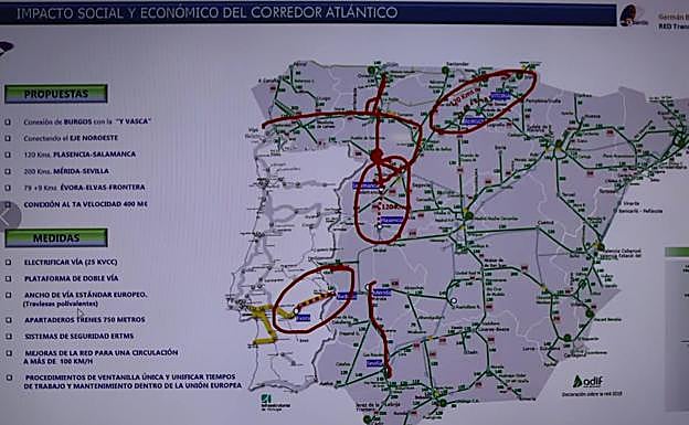 También se refirió a la importancia de Sines, en Portugal, y Algeciras como puertos de acceso de mercancías desde América y África respectivamente, y explicó que el Corredor Atlántico tiene un problema, «todos los puertos llevan sus mercancías a Madrid, incluidos los del Corredor Mediterráneo, lo que lo convierte en un cuello de botella, porque además, en primer lugar la red ferroviaria da prioridad al transporte de personas del área metropolitana, luego a la línea del AVE y lo último son las mercancías».