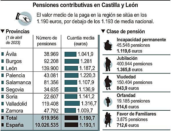 El número de pensiones en la Comunidad subió un 0,56 por ciento en la tasa interanual, hasta las 619.956. Del total, el 64,6 por ciento (400.944) corresponde a jubilación, con una pensión media que asciende a 1.365,81 euros. Por incapacidad permanente son 45.548 pensiones con las que cuenta Castilla y León, con una media de 1.119,64 euros. Por viudedad, existen 150.404 pensiones (8435,94 euros de media); por orfandad, 19.1856 (514,67 euros de media), y en favor de familiares, 3.875 (712,59 euros de media).